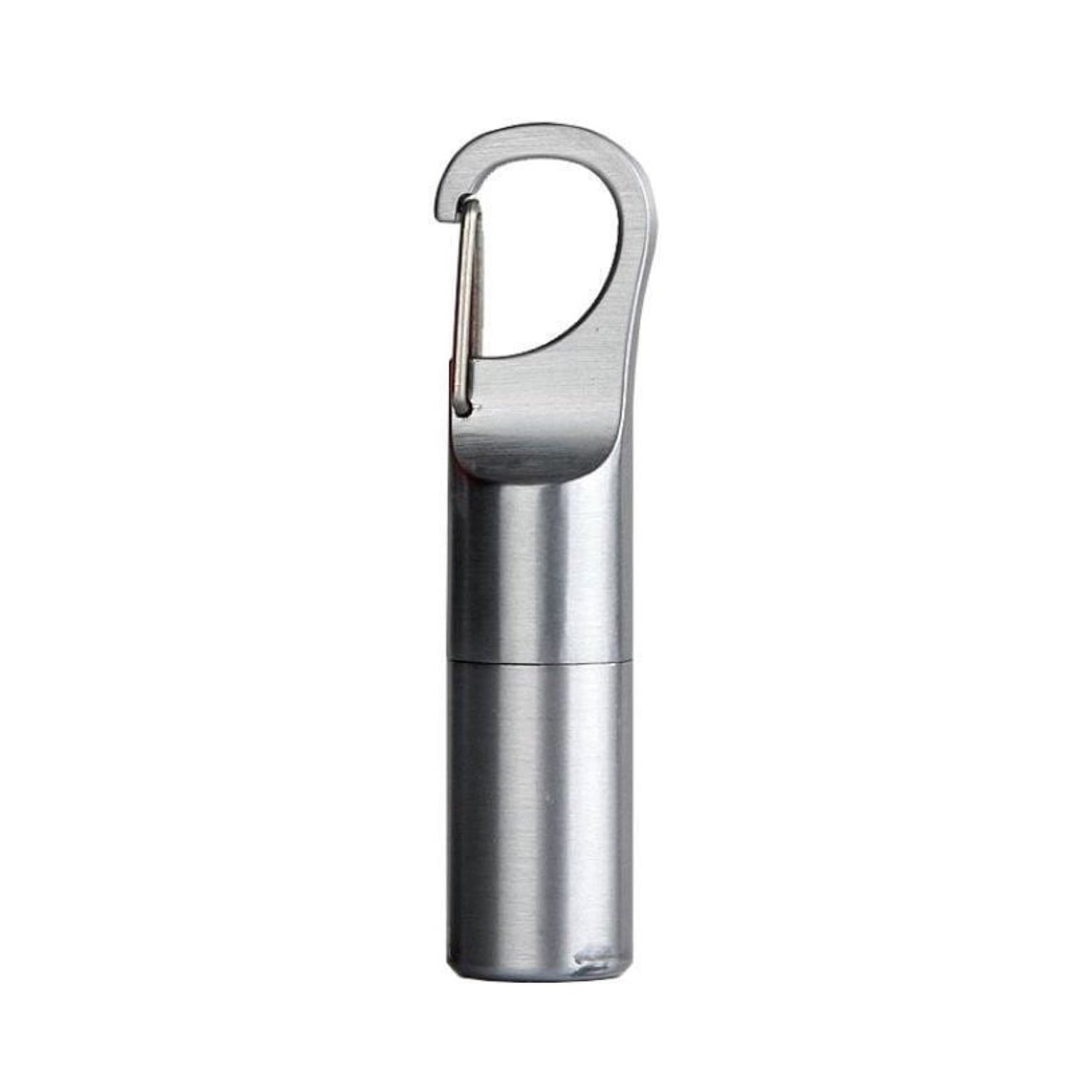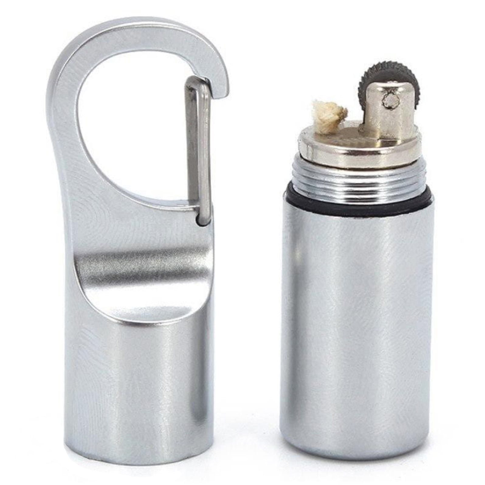 Accendino piccolo e leggero in custodia impermeabile in acciaio inossidabile. È dotato di guarnizione in gomma e tappo a vite. Il tappo è inoltre provvisto di un moschettone nella parte superiore che consente di fissare facilmente l'accendino alle chiavi, allo zaino o ad altri accessori simili. Fornito senza ricarica.