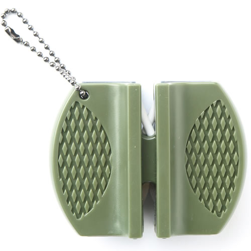 Affilacoltelli semplice. Da un lato affilatura grossolana con carburo, dall'altro lato dotato di ceramica per affilatura fine.