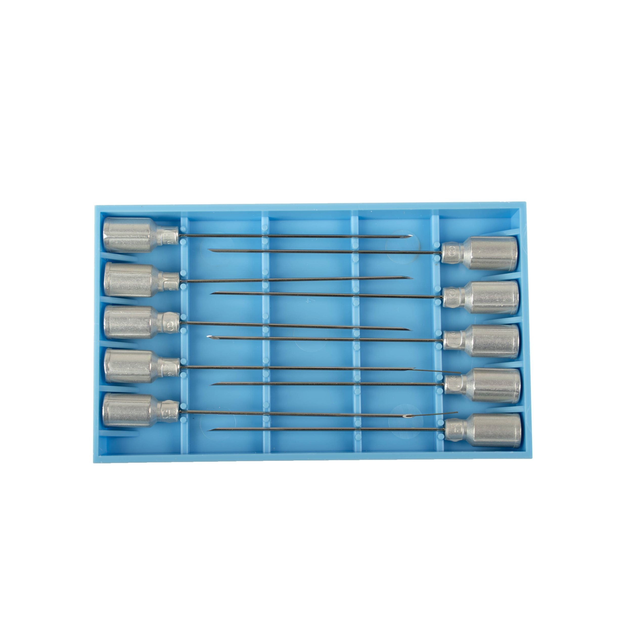 Set di aghi in acciaio inossidabile per iniezioni in dieci scatole di plastica confezionate in una scatola di carta.