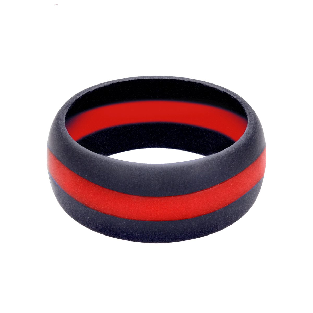 Anello in silicone con striscia blu al centro. Non in tutte le professioni è opportuno e soprattutto sicuro indossare anelli, non solo quelli nuziali. L'anello in silicone è l'alternativa ideale, poiché è realizzato in materiale morbido ed elimina la possibilità di eventuali lesioni che potrebbero essere causate da un anello in metallo. La linea rossa nell'anello non è stata scelta casualmente, ma rappresenta un simbolo di sostegno ai vigili del fuoco.