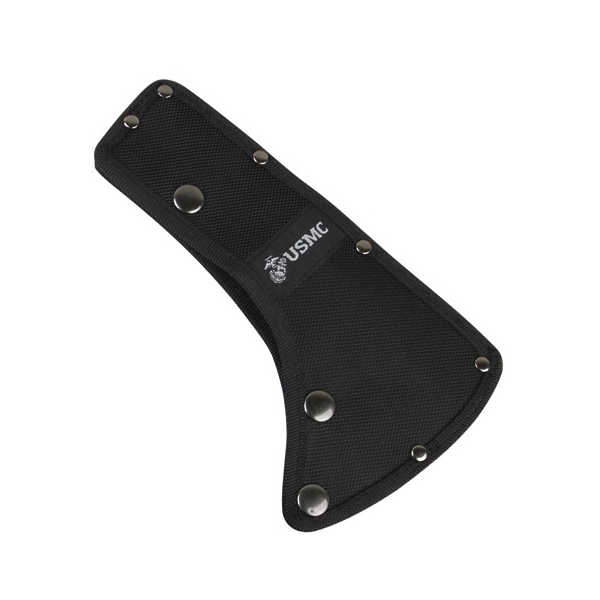 La confezione include anche una copertura per la lama dell'ascia. Sulla custodia è presente il logo e la scritta USMC. L'ascia è fissata alla custodia tramite due bottoni automatici in metallo. Sul retro della custodia è presente un passante che consente di agganciarla alla cintura con una larghezza di circa 5 cm. La lama in acciaio inossidabile è di colore nero.