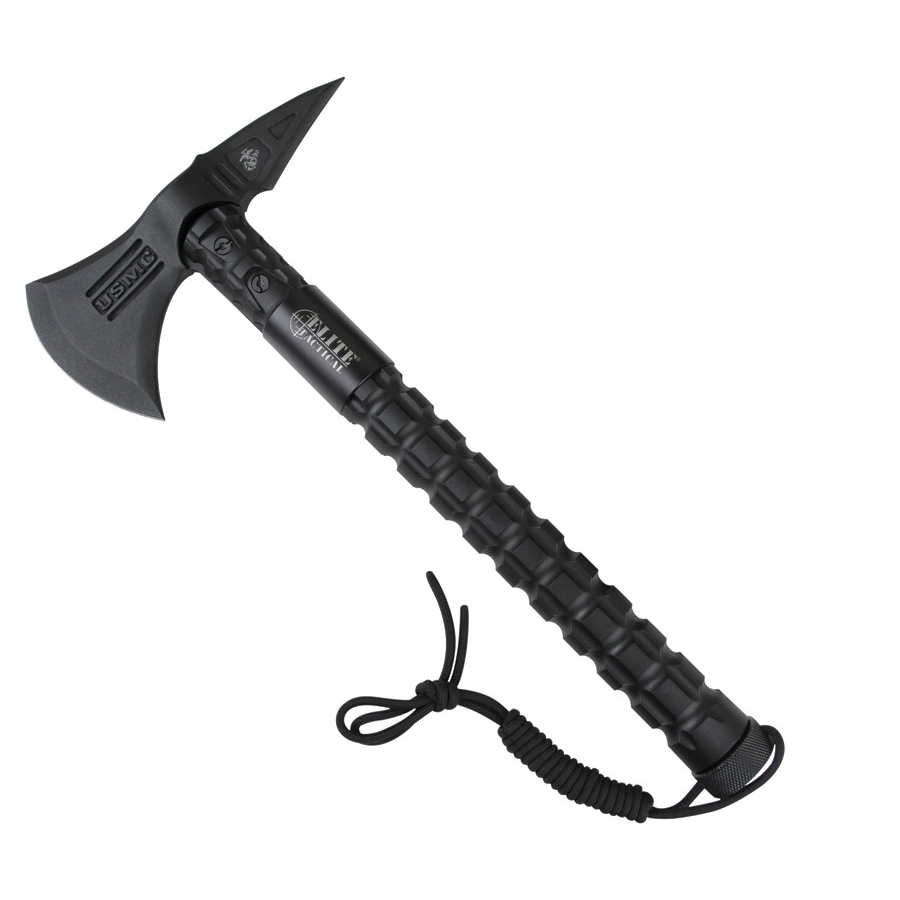 La testa dell'ascia è realizzata in acciaio inossidabile con un lato classico per tagliare e mentre l'altra estremità presenta una punta affilata. La lama è annerita per evitare eventuali riflessi indesiderati quando è necessario nascondersi, non rivelare la propria posizione al nemico o a un inseguitore. Sulla lama è impressa l'abbreviazione USMC e il logo. Il manico è realizzato in nylon resistente, rinforzato con fibra di vetro. Il manico è marcatamente articolato e ha un effetto antiscivolo.