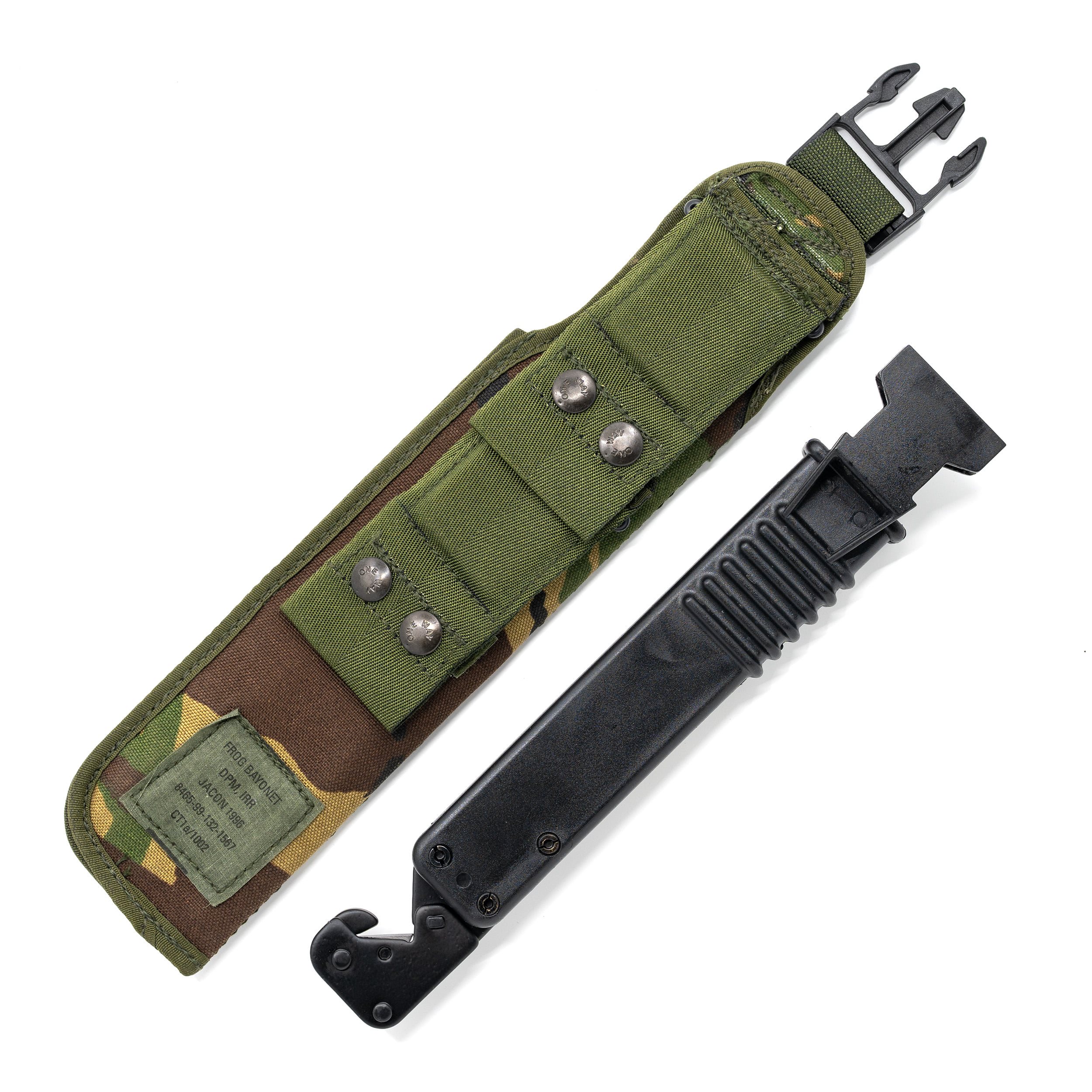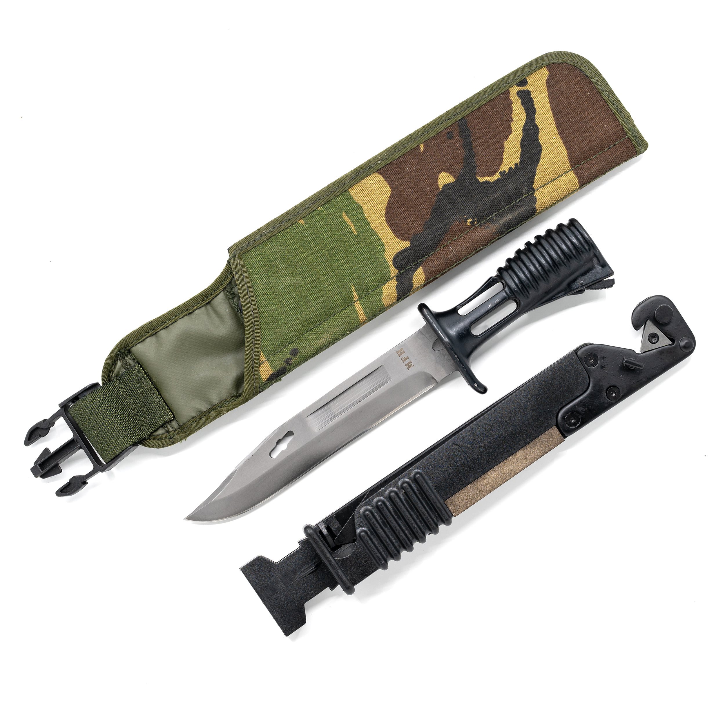 Riproduzione della baionetta britannica tipo SA80. Fornita con fodero in tessuto con inserto rigido, nel quale è nascosto un seghetto pieghevole di circa 17 cm, un affilacoltelli e un perno da inserire nel foro della baionetta. Insieme fungono da pinze.