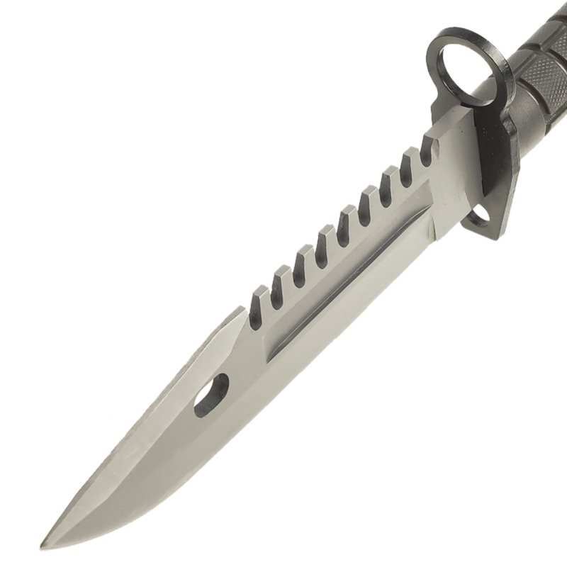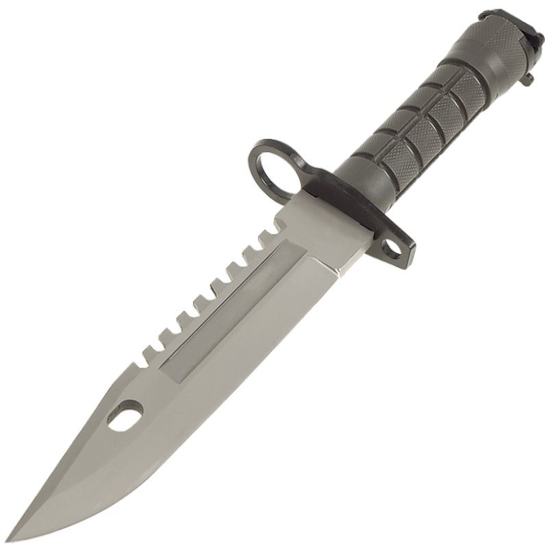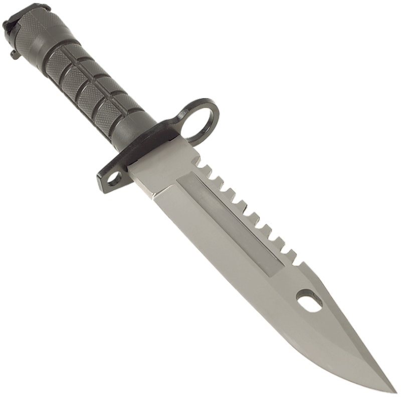 Baionetta robusta realizzata secondo il modello classico, entrata in servizio nell'esercito americano nel 1986. Proprio come il modello originale, anche questo coltello presenta una struttura robusta adatta a una vasta gamma di attività. La lama del coltello, con filo liscio, è realizzata in resistente acciaio inossidabile 420; sul dorso è presente una sega, mentre nella parte anteriore si trova un foro che, in combinazione con il fodero, serve per tagliare il filo metallico. La guardia metallica del coltello serve non solo a fissarlo al fucile d'assalto, ma anche a proteggere la mano durante il lavoro. L'impugnatura è realizzata in plastica rinforzata con una texture antiscivolo che garantisce una presa salda in tutte le condizioni. Il coltello viene fornito con un robusto fodero da cintura dotato di una fibbia in plastica rigida.