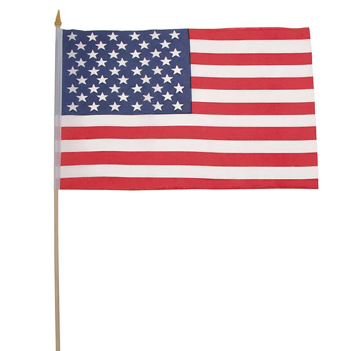 Bandiera degli Stati Uniti su asta di legno, dimensioni circa 30 x 45 cm.