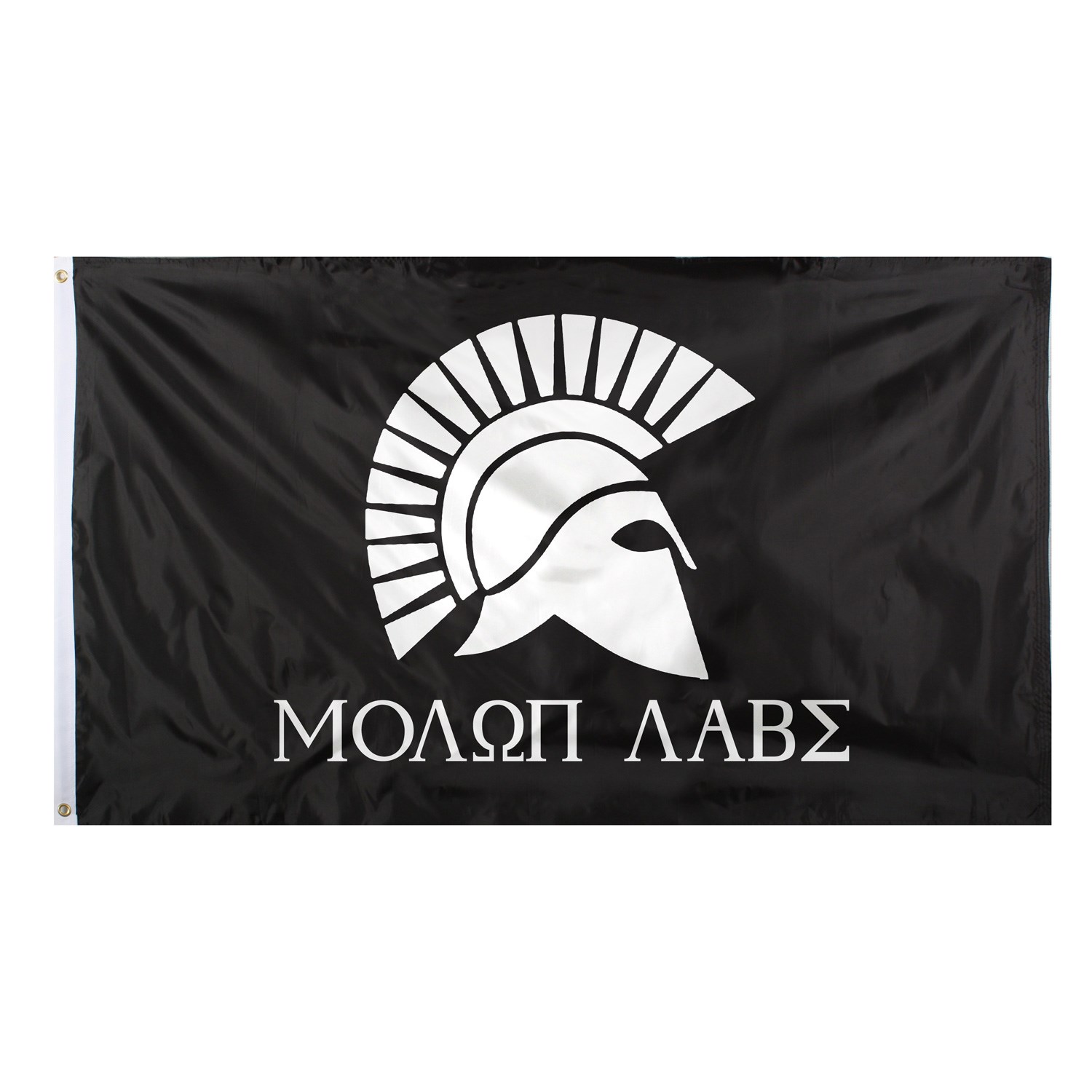 Bandiera Molon Labe con scritta in greco e elmo spartano. Dimensioni: circa 90 x 150 cm. Ulteriori informazioni