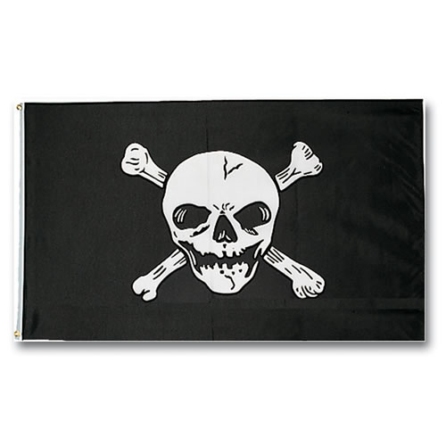 Bandiera pirata - su sfondo nero è raffigurato un teschio bianco su ossa incrociate. Due occhielli metallici per il fissaggio.