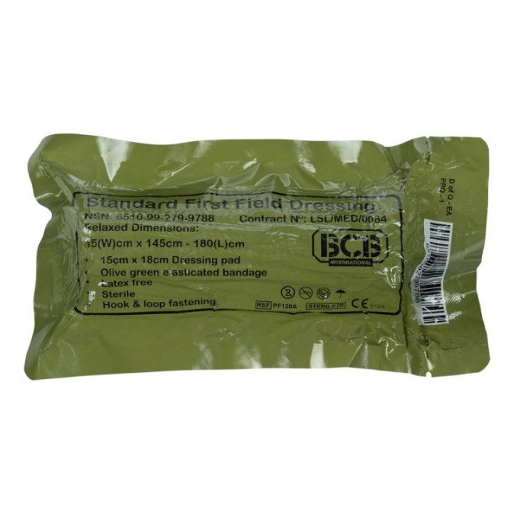 Benda monouso sterile destinata all'uso medico, sia civile che militare. È elastica e si fissa con un'estremità in velcro. La benda è dotata di un'imbottitura interna di 15 x 18 cm. Confezionata sottovuoto, senza lattice. Approvata secondo NATO NSN: 6510-99-279-9788.
