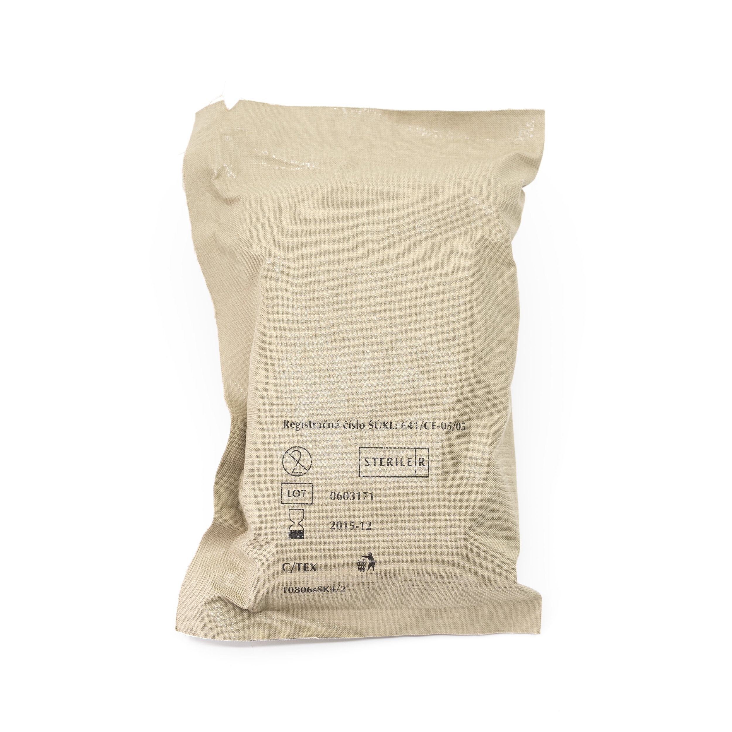 Bendaggio compressivo tascabile originale utilizzato dall'esercito slovacco. Il set comprende una benda color cachi, una garza e una spilla da balia.