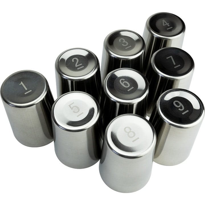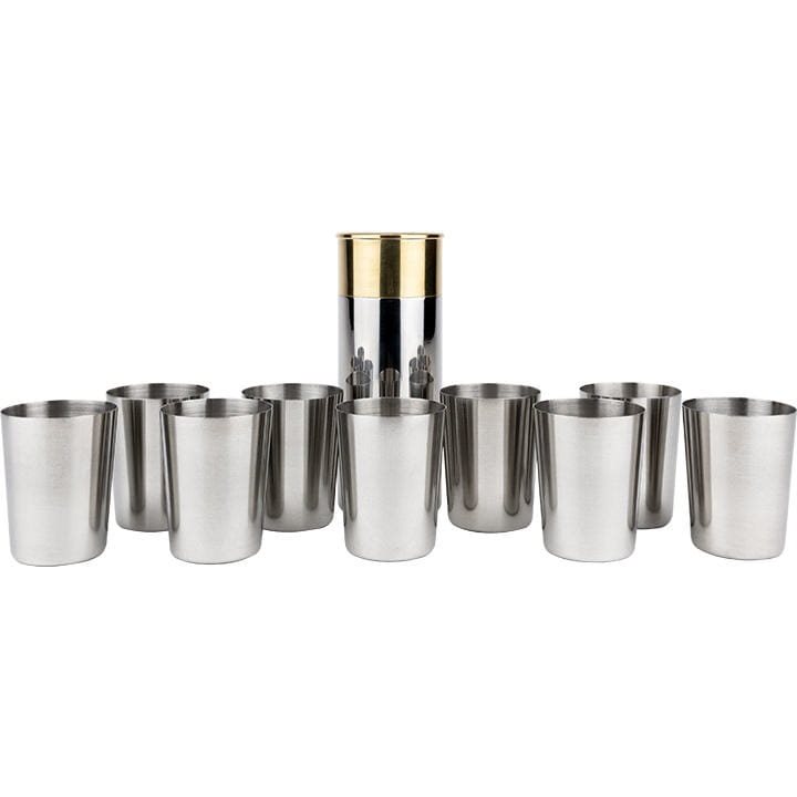Set di nove bicchierini con supporto in acciaio inossidabile, il tutto contenuto in una confezione regalo di colore nero. I bicchierini sono realizzati in acciaio inossidabile lucido di qualità alimentare, che non altera in alcun modo il gusto delle bevande servite. La capacità dei bicchierini è di 50 ml e possono essere facilmente impilati, riposti nel supporto a forma di cartuccia in dotazione e successivamente conservati senza timore di perdere le singole parti. Un regalo ideale per gli appassionati di tiro.