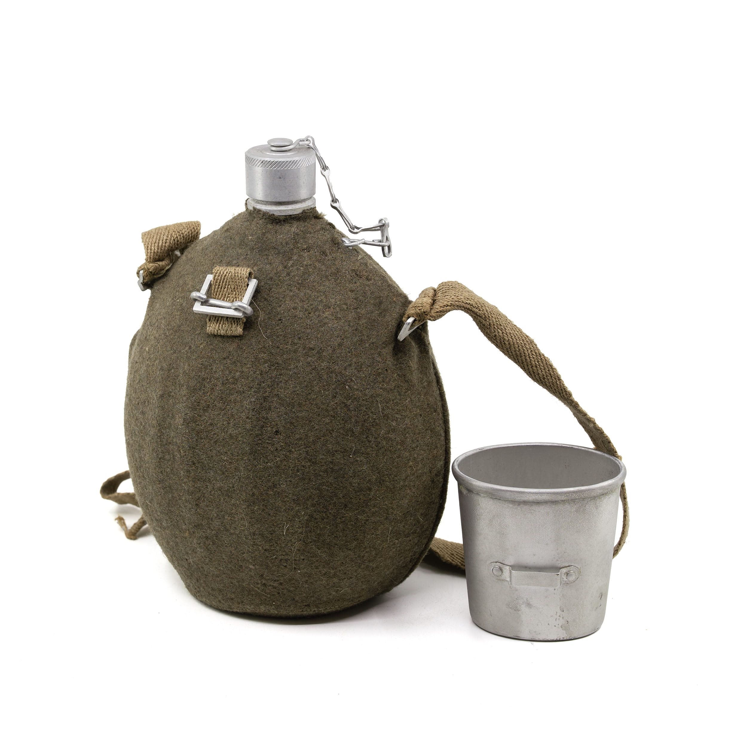 Vecchia borraccia in alluminio dell'esercito italiano del dopoguerra. Dimensioni: circa 27 x 18 x 11 cm. Merce immagazzinata a lungo termine. Per lo più nuova o leggermente usata, ma con segni esterni di usura dovuti allo stoccaggio e alla manipolazione. La custodia in feltro potrebbe presentare tracce di tarme.