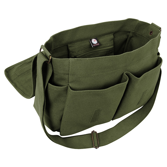 Borsa a tracolla in tela con logo AIR CORP. Due tasche frontali, due tasche laterali, tracolla regolabile. Larghezza della tracolla 5 cm, lunghezza massima regolabile 130 cm. Dimensioni della borsa 37 x 27 x 15 cm.