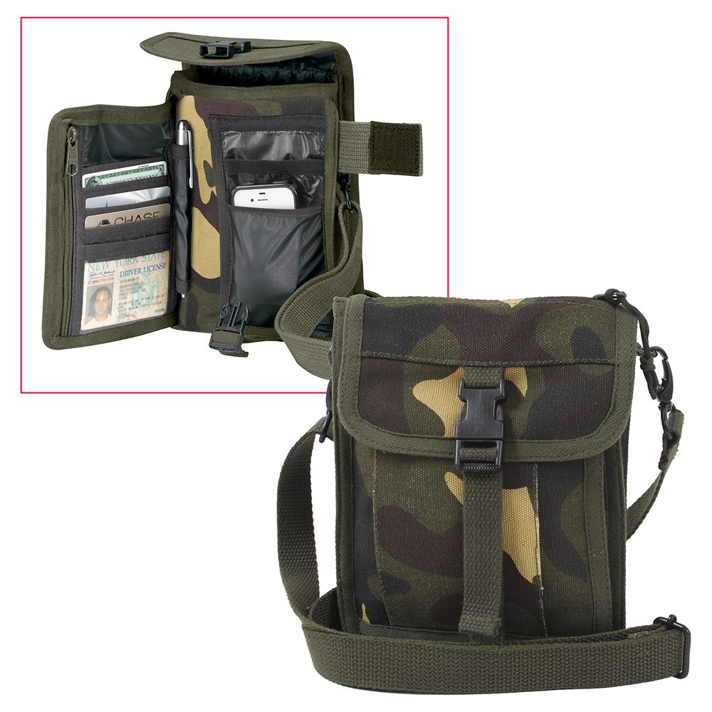 Borsa a tracolla in tela con numerosi scomparti e tasche.