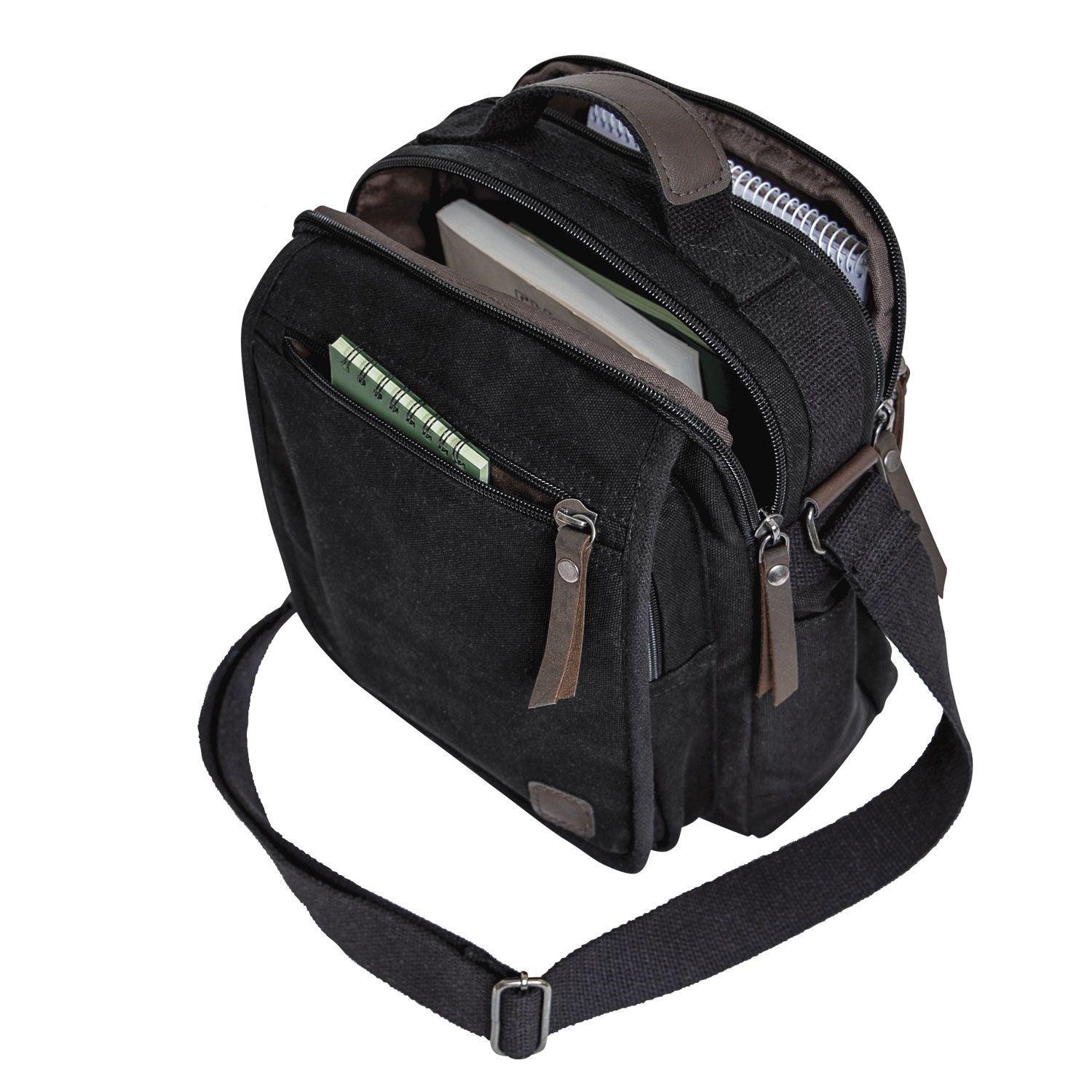 Borsa a tracolla realizzata in cotone al 100%, con 2 tasche interne, 1 tasca frontale, tasca nella patta che copre parte della borsa, 2 tasche laterali. Tracolla regolabile, manico per il trasporto a mano. Dimensioni 28 x 22 x 13 cm. Ulteriori informazioni