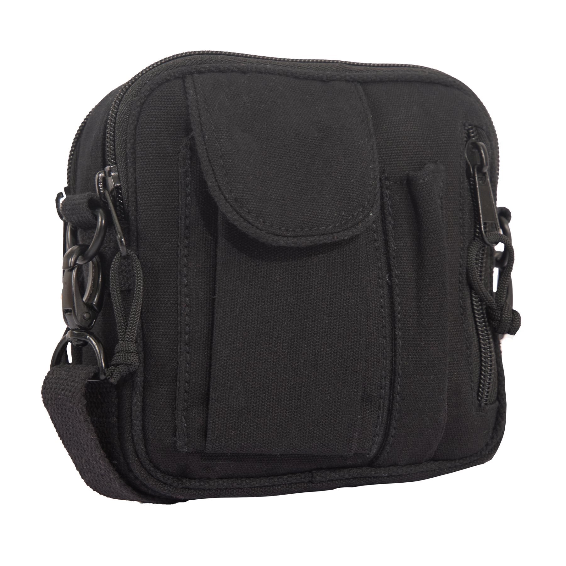 Piccola borsa a tracolla in stile militare retrò. Realizzata in robusto tessuto di cotone. Presenta due scomparti principali con chiusura a zip, uno dei quali contiene un ulteriore scomparto più piccolo con chiusura a zip. All'esterno è presente una tasca con chiusura in velcro (delle dimensioni di un telefono cellulare), una tasca con chiusura a zip e un passante per penna. Sul retro sono presenti passanti per il fissaggio alla cintura. La tracolla in tessuto regolabile è staccabile. Dimensioni: 18 x 16 x 7 cm.