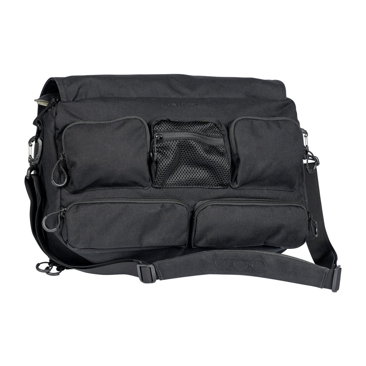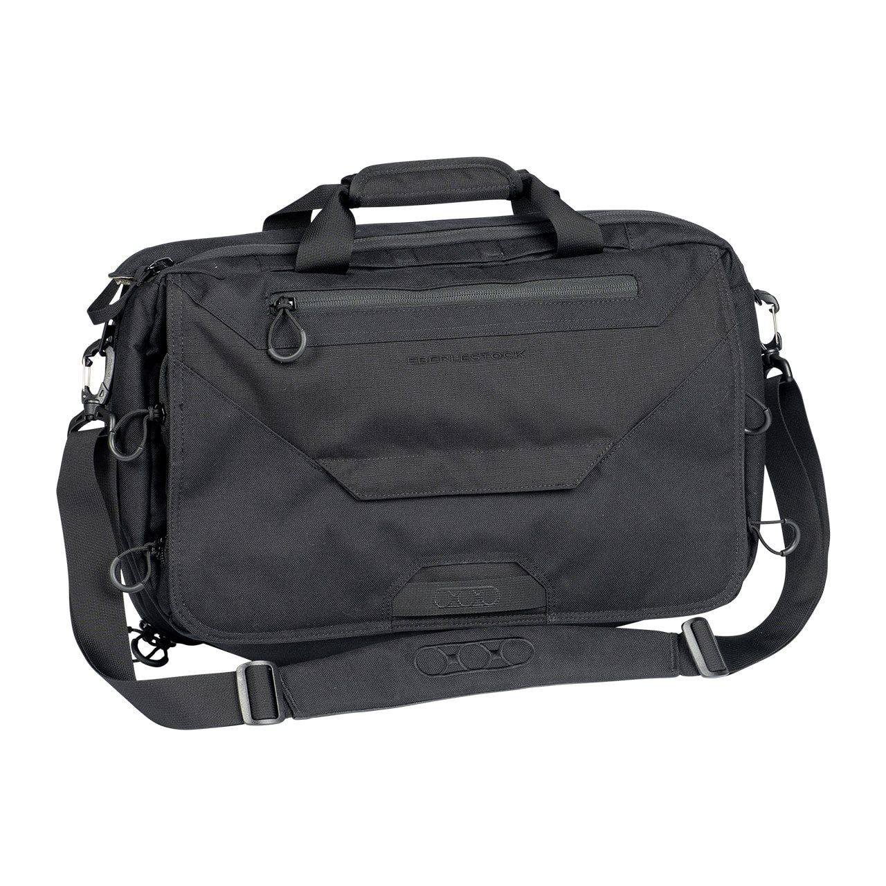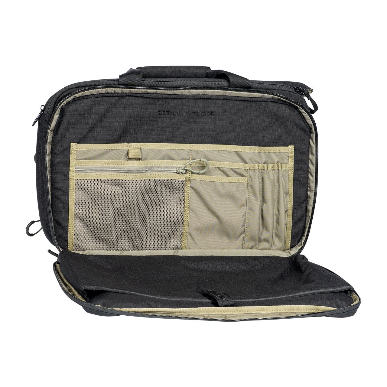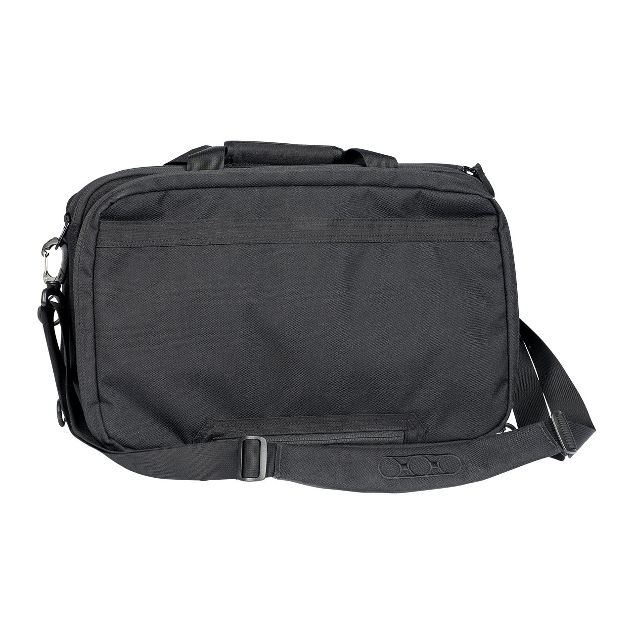 Per il trasporto, la borsa è dotata di una tracolla antiscivolo rimovibile e di una coppia di maniglie agganciabili. La patta frontale nasconde una piccola tasca piatta e, una volta aperta, sotto di essa si trovano cinque tasche chiudibili con cerniera. La borsa dispone di due scomparti principali. Quello anteriore è dotato di un organizer piuttosto capiente e di uno scomparto per laptop fino a 17". Lo scomparto posteriore è accessibile tramite una doppia cerniera coperta da una patta imbottita. Sul retro si trova uno scomparto con fondo a cerniera. Quando la cerniera è chiusa, lo scomparto può essere utilizzato per riporre documenti, mentre quando è aperta può essere utilizzato per agganciare la borsa alle maniglie di una valigia.