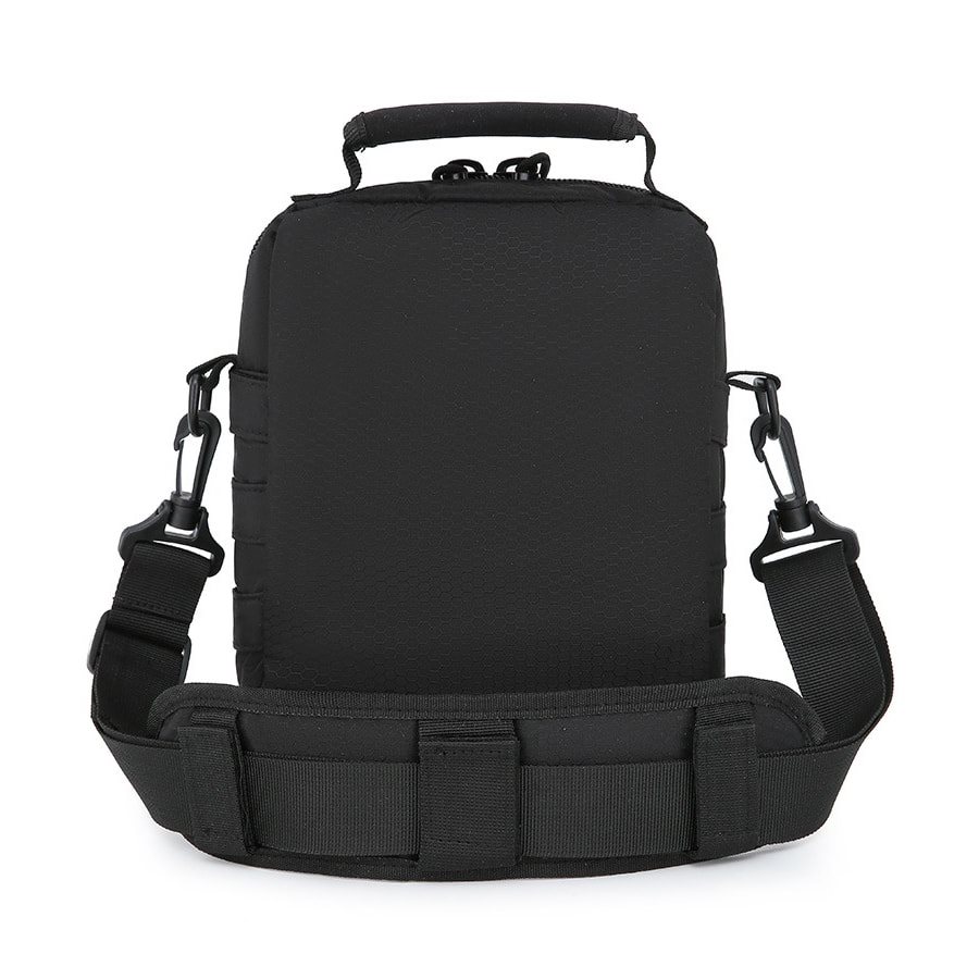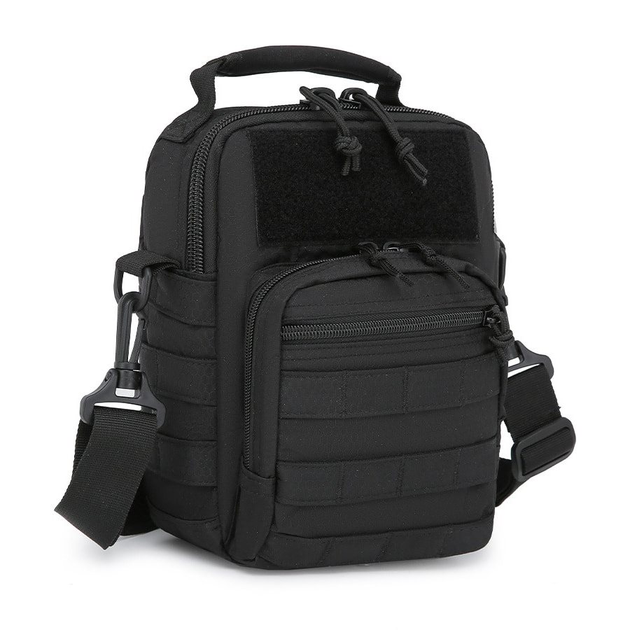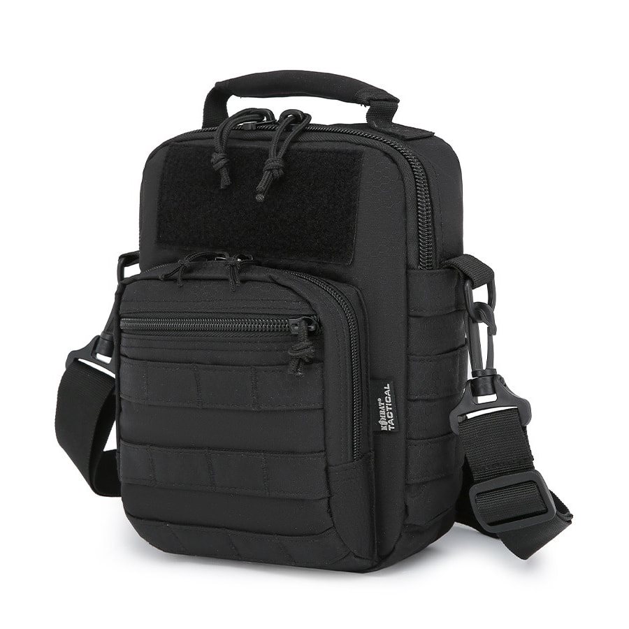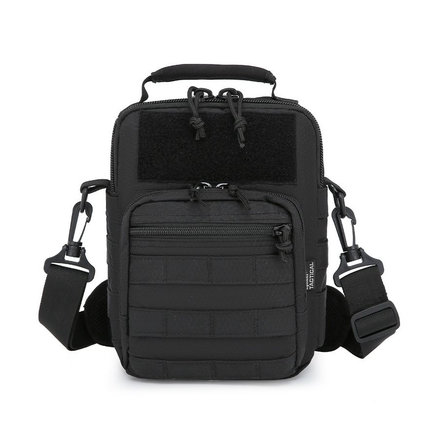 La tracolla rimovibile della borsa è fissata agli anelli a D in plastica tramite moschettoni, è regolabile in lunghezza e dotata di un segmento imbottito rimovibile. Ai lati della borsa si trova un sistema di aggancio modulare standard MOLLE/PALS, che può essere utilizzato per fissare piccole custodie o per appendere moschettoni o strumenti di scrittura. Sulla parte frontale si trova un altro sistema di aggancio modulare e due tasche accessibili tramite cerniera. Sulla parte superiore della borsa si trova una striscia di velcro per le vostre toppe VELCRO e una maniglia di trasporto in neoprene. Lo scomparto principale è accessibile tramite una cerniera a doppio cursore e al suo interno si trova uno scomparto in pile adatto per riporre una pistola.