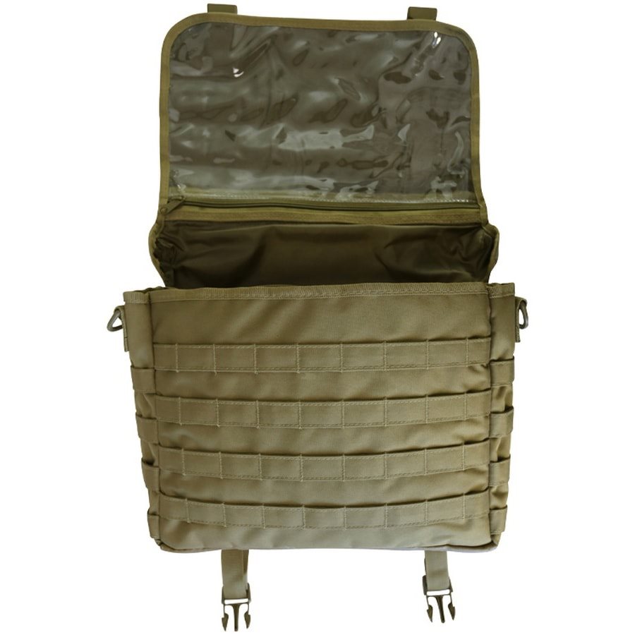 Borsa tattica a tracolla di medie dimensioni con sistema di aggancio MOLLE/PALS nella parte anteriore e posteriore. Sulla patta di chiusura è presente una cerniera che consente di accedere a una tasca piatta per documenti e un pannello in velcro per il fissaggio di patch con chiusura in velcro. La tracolla regolabile è imbottita, in modo da non causare fastidio alla spalla anche con carichi pesanti. La tracolla può essere fissata con un sistema di aggancio in velcro. con velcro. La tracolla regolabile è imbottita, quindi anche con un carico maggiore la borsa non premerà sulla spalla. La tracolla può essere staccata con dei moschettoni e la borsa può essere trasportata a mano. La tracolla è dotata di una linguetta in tessuto per il trasporto.