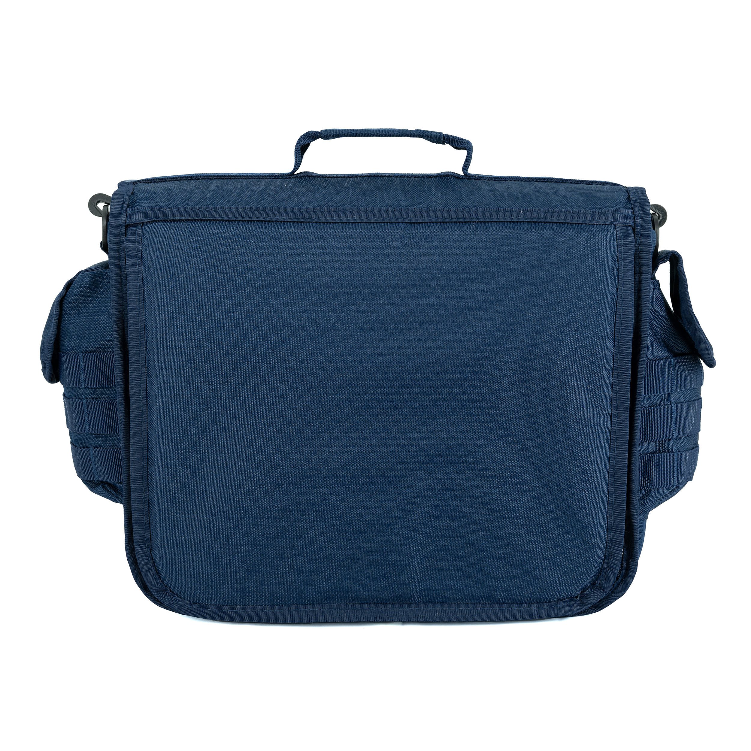 Borsa multifunzionale con tracolla staccabile e regolabile in lunghezza e manico superiore semplice per il trasporto. La borsa si chiude con una patta fissata da due fibbie in plastica. Le tasche laterali sono coperte da patelle. Lo spazio principale della borsa è suddiviso in due ampi scomparti e un pratico organizer. L'organizer dispone di diversi scomparti per gli strumenti di scrittura, una tasca con finestra trasparente e diversi scomparti piatti. Lo scomparto anteriore è senza divisori, quello posteriore contiene una tasca piatta con chiusura a zip.