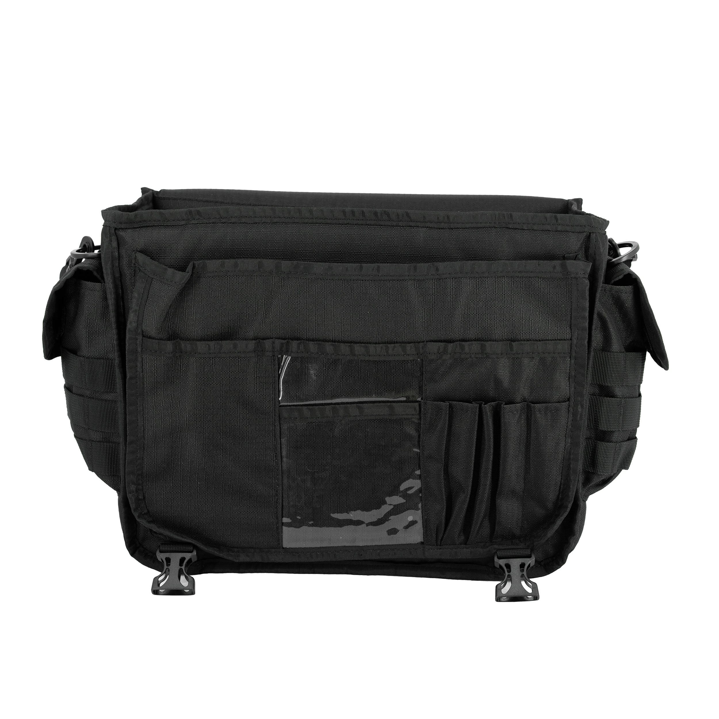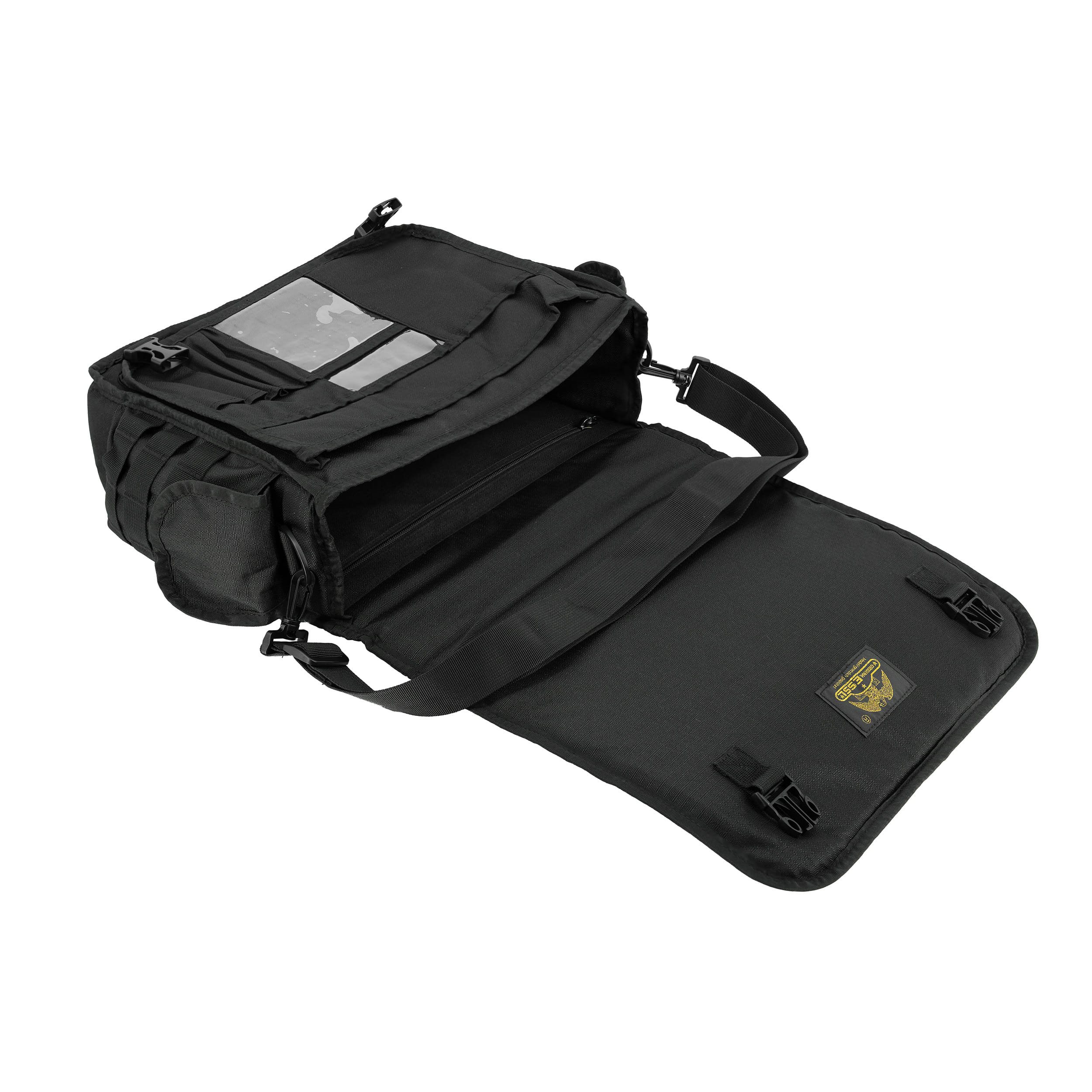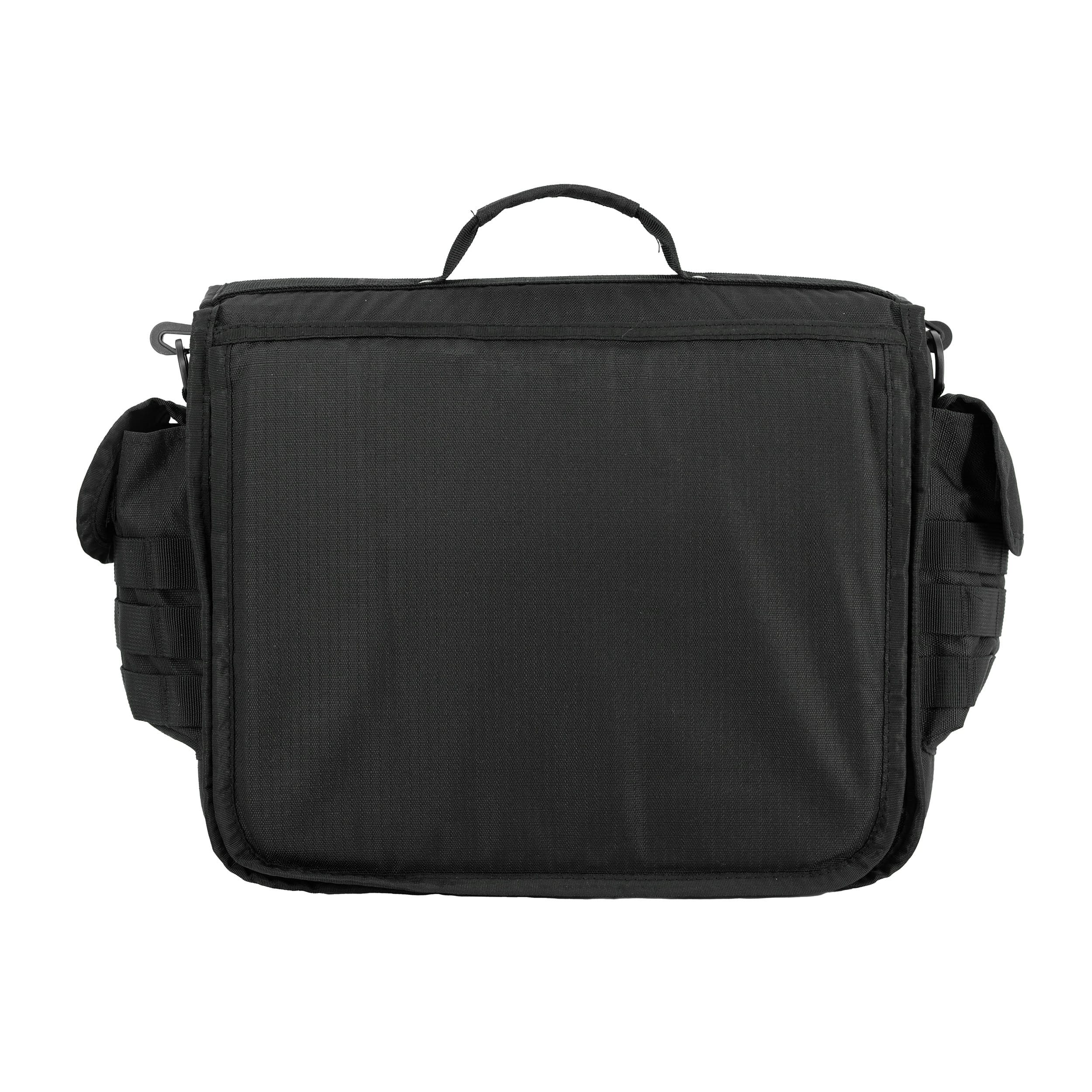 Borsa multifunzionale con tracolla staccabile e regolabile in lunghezza e maniglia superiore semplice per il trasporto. La borsa si chiude con una patta fissata da due fibbie in plastica. Le tasche laterali sono coperte da patte. Lo spazio principale della borsa è suddiviso in due ampi scomparti e un pratico organizer. L'organizer dispone di diversi scomparti per gli strumenti di scrittura, una tasca con finestra trasparente e diversi scomparti piatti. Lo scomparto anteriore è senza divisori, quello posteriore contiene una tasca piatta con chiusura a zip.