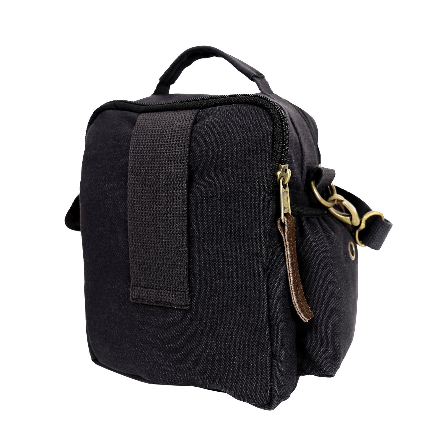 Borsa da viaggio in tela con tracolla e dettagli in pelle. Ideale per documenti, telefono, macchina fotografica e altri piccoli oggetti.
