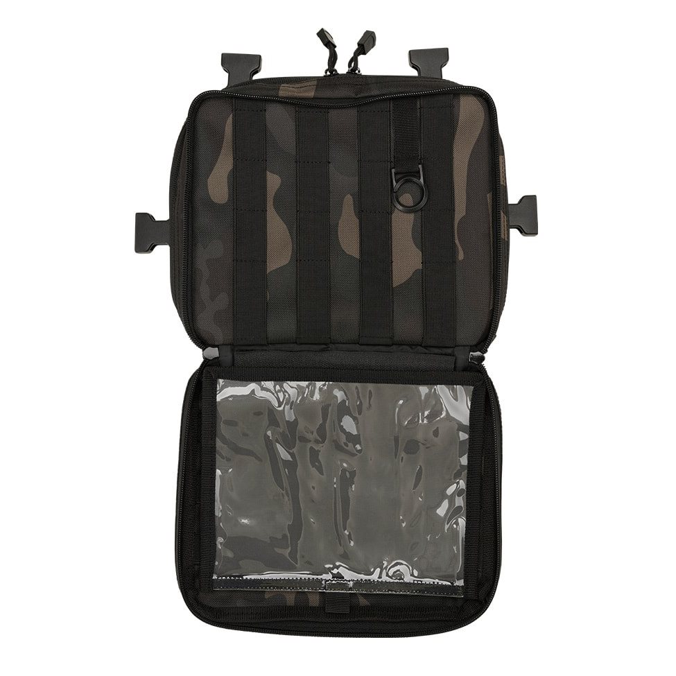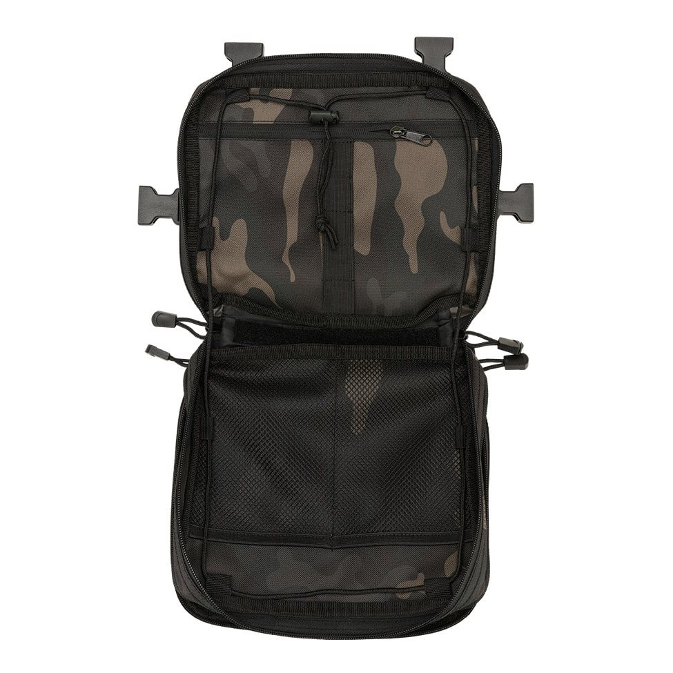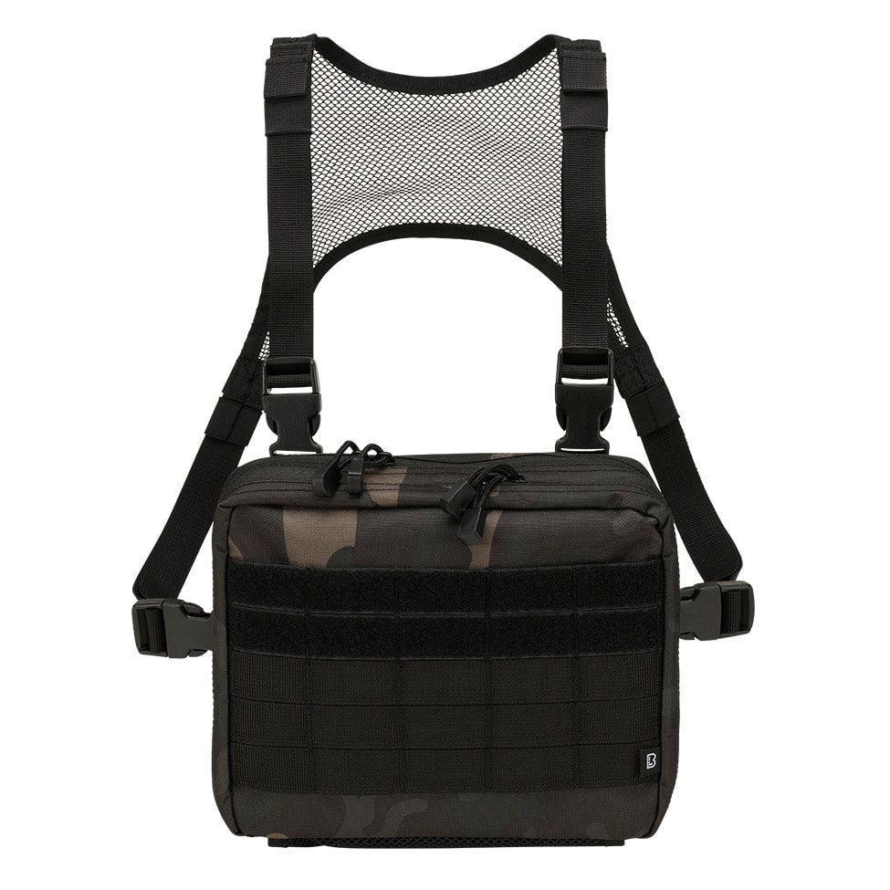 Le cinghie di trasporto hanno una forma a H e sono in parte costituite da una rete molto traspirante e leggera e in parte da cinghie classiche fissate con quattro fibbie FASTEX in plastica con possibilità di sgancio rapido. Il retro della borsa è piacevolmente imbottito con una morbida rete 3D. La parte anteriore è cucita con sei file di cuciture modulari standard MOLLE/PALS. Le due file superiori sono inoltre combinate con velcro. È quindi possibile dotare facilmente la borsa di attrezzature compatibili aggiuntive e personalizzarla con toppe e etichette con velcro. Sul fondo della borsa si trova una piccola tasca in rete.