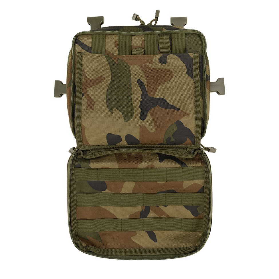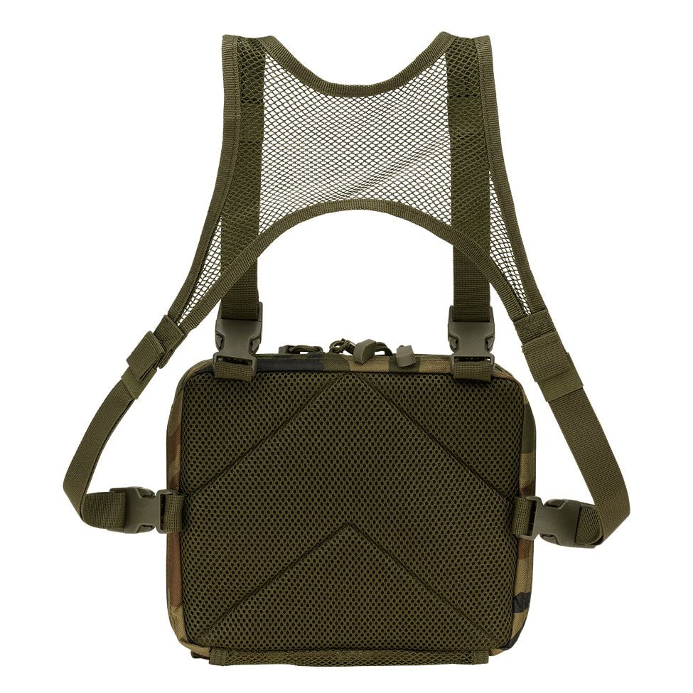Le cinghie di trasporto hanno una forma a H e sono in parte costituite da una rete molto traspirante e leggera e in parte da cinghie classiche fissate con quattro fibbie FASTEX in plastica con possibilità di sgancio rapido. Il retro della borsa è piacevolmente imbottito con una morbida rete 3D. La parte anteriore è cucita con sei file di cuciture modulari standard MOLLE/PALS. Le due file superiori sono inoltre combinate con velcro. È quindi possibile dotare facilmente la borsa di attrezzature compatibili aggiuntive e personalizzarla con toppe e etichette con velcro. Sul fondo della borsa si trova una piccola tasca in rete.