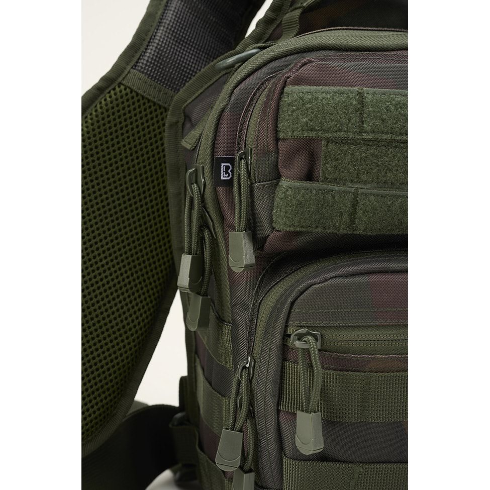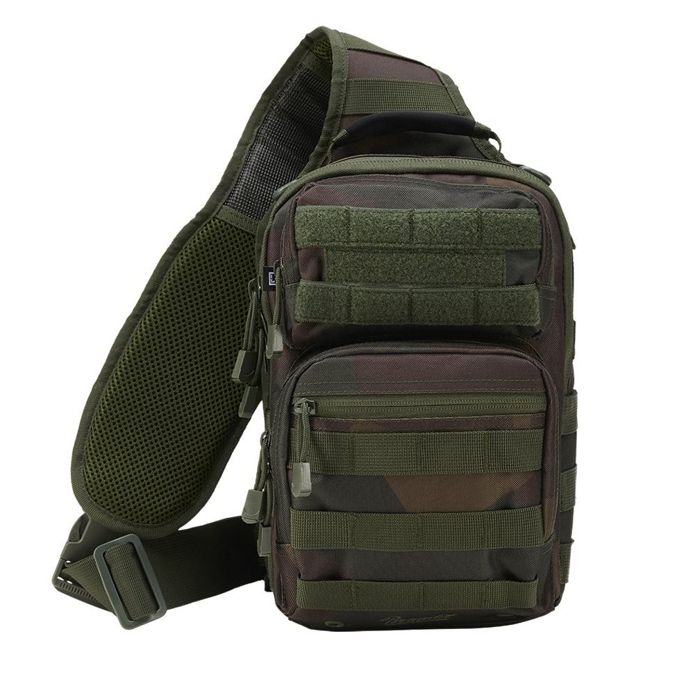 La tracolla regolabile in lunghezza è in gran parte imbottita con rete 3D, dotata di antiscivolo, anelli a D in plastica, elastici e tasca per smartphone di dimensioni massime 8 x 16 cm. La chiusura della tracolla è realizzata con una fibbia in plastica. Anche la cinghia di stabilizzazione laterale è chiusa con una fibbia e può essere rimossa se necessario. Sulla parte anteriore sono presenti due tasche. La tasca superiore è rivestita esternamente con una trama MOLLE/PALS combinata con velcro per posizionare le vostre toppe VELCRO. Si chiude con una cerniera a senso unico e al suo interno sono presenti tre elastici e una tasca piatta per piccoli documenti. Anche la tasca inferiore è rivestita con una trama modulare, dispone di una tasca esterna piatta e di uno spazio interno senza divisori. La tasca principale è accessibile tramite una cerniera a doppio senso e al suo interno è presente uno scomparto elastico con elastico fissato con velcro. Altre due tasche si trovano sulla parte anteriore dello scomparto principale. L'ultimo scomparto si trova sul retro della borsa. È dotato di un rivestimento antiscivolo all'esterno e può contenere un tablet di dimensioni massime 16 x 27 cm.