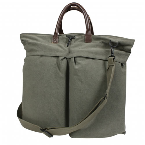 Borsa in tela per casco con tracolla regolabile e due tasche esterne. Manici in pelle e cerniera in ottone.