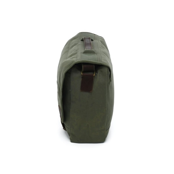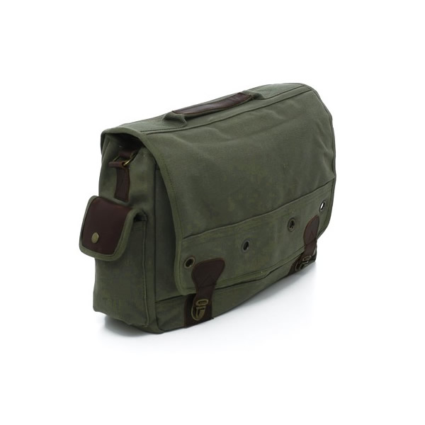 Borsa a tracolla Trailblazer della ditta Rothco, realizzata in cotone pesante, con dettagli in pelle. La patta frontale presenta quattro occhielli in ottone e due chiusure in ottone su cinturino in pelle. La borsa dispone di un ampio scomparto principale e di custodie imbottite con cinturino di sicurezza per laptop. Inoltre, la borsa presenta due tasche frontali e una tasca laterale, ideali per riporre penne, matite e altri accessori.