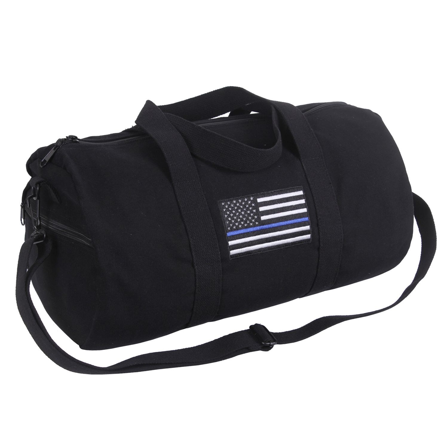 Borsa semplice e allo stesso tempo pratica, realizzata in tela resistente. Sul lato è presente la bandiera degli Stati Uniti d'America con una striscia blu che simboleggia il sostegno e il rispetto nei confronti dei membri della Polizia. Cinghia a tracolla regolabile e rimovibile.