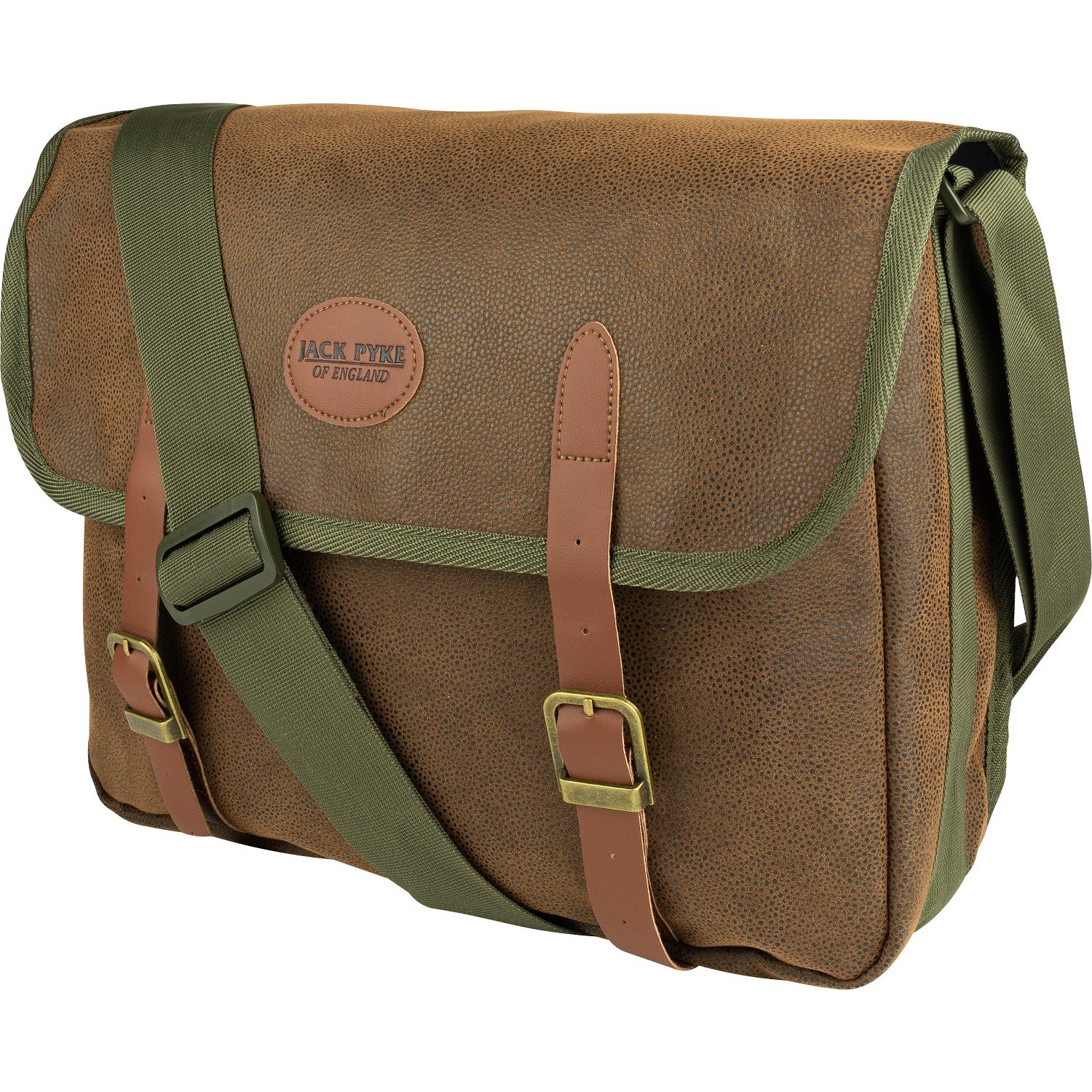Borsa a tracolla di grandi dimensioni in elegante stile inglese da caccia con accessori in pelle, prodotta da Jack Pyke. Adatta non solo per cacciatori e guardiacaccia. Realizzata in materiale DOUTEX (Durable Outer Textile), molto resistente e con una superficie simile alla pelle.