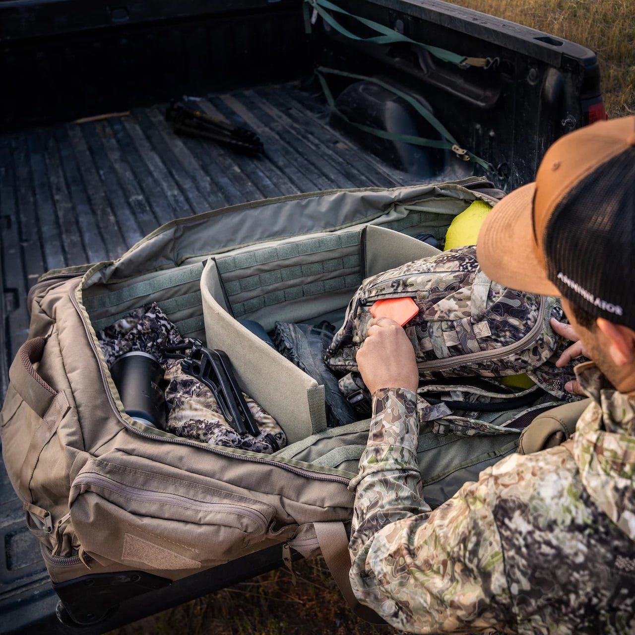 La borsa HERCULES ha essenzialmente due scomparti principali, entrambi accessibili tramite cerniere YKK® a doppio cursore con tiretti piatti in tessuto. La parte superiore della borsa è rivestita internamente in Nylex®, un tessuto felpato a pelo corto. Questo tessuto felpato può essere utilizzato per fissare attrezzature compatibili o per dividere lo spazio utilizzando due divisori morbidi forniti con la borsa. I lati interni sono rivestiti con tre file di passanti MOLLE/PALS. Lo spazio inferiore è diviso in due scomparti da una parete impermeabile chiusa con cerniera. Ciò è utile, ad esempio, se si desidera separare gli indumenti asciutti da quelli bagnati o quelli sporchi da quelli puliti. Lo scomparto inferiore è anche imbottito e dotato di una coppia di cinghie di compressione, quindi non dovrete preoccuparvi di riporre al suo interno la vostra arma da fuoco o il vostro arco da caccia. Se durante il viaggio doveste incontrare condizioni meteorologiche avverse, in uno scomparto nascosto è riposto un impermeabile color coyote brown che copre comodamente l'intera borsa.