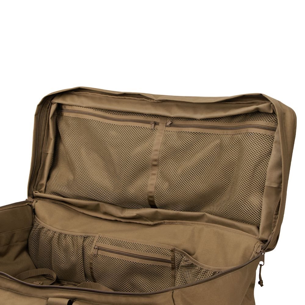 Borsa da viaggio di grandi dimensioni con ruote, diverse maniglie per il trasporto e numerose tasche esterne e interne. La capacità di base di 104 litri può essere aumentata fino a 145 litri aprendo una cerniera.