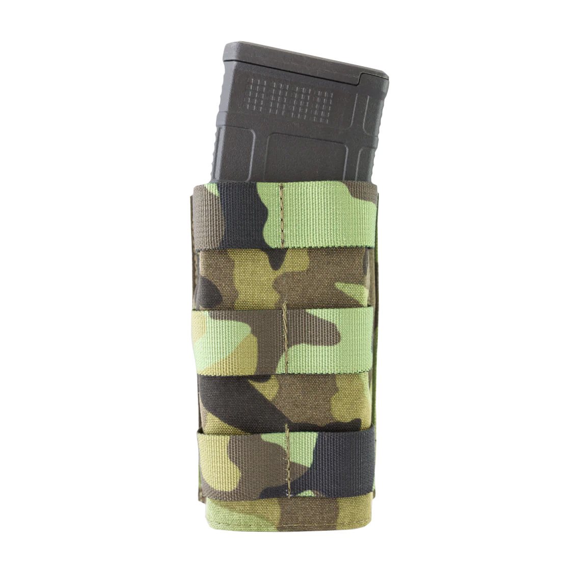 La custodia autoadesiva FAST per 1 caricatore AR 15 è realizzata con un inserto in kydex che trattiene il caricatore inserito e un rivestimento in Cordura. È progettata in modo tale che il caricatore possa essere facilmente rimosso e reinserito durante la ricarica tattica. Sul lato anteriore della custodia è cucito un sistema di aggancio MOLLE per fissare altre custodie.