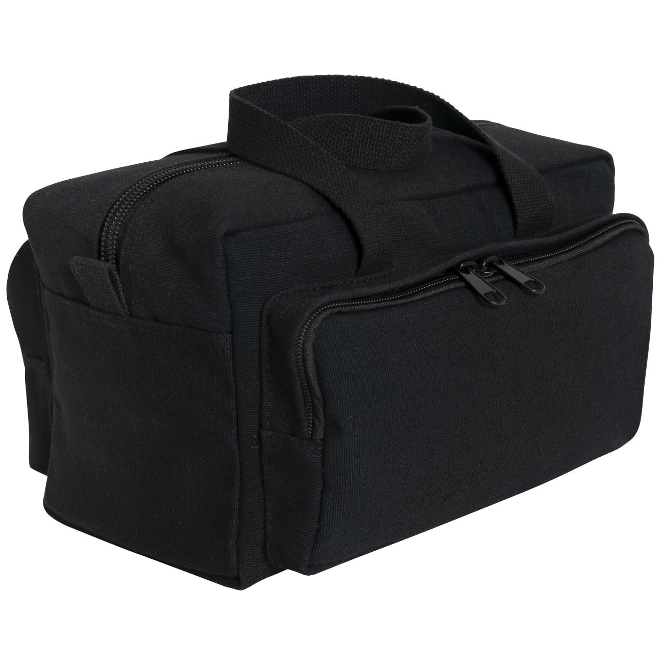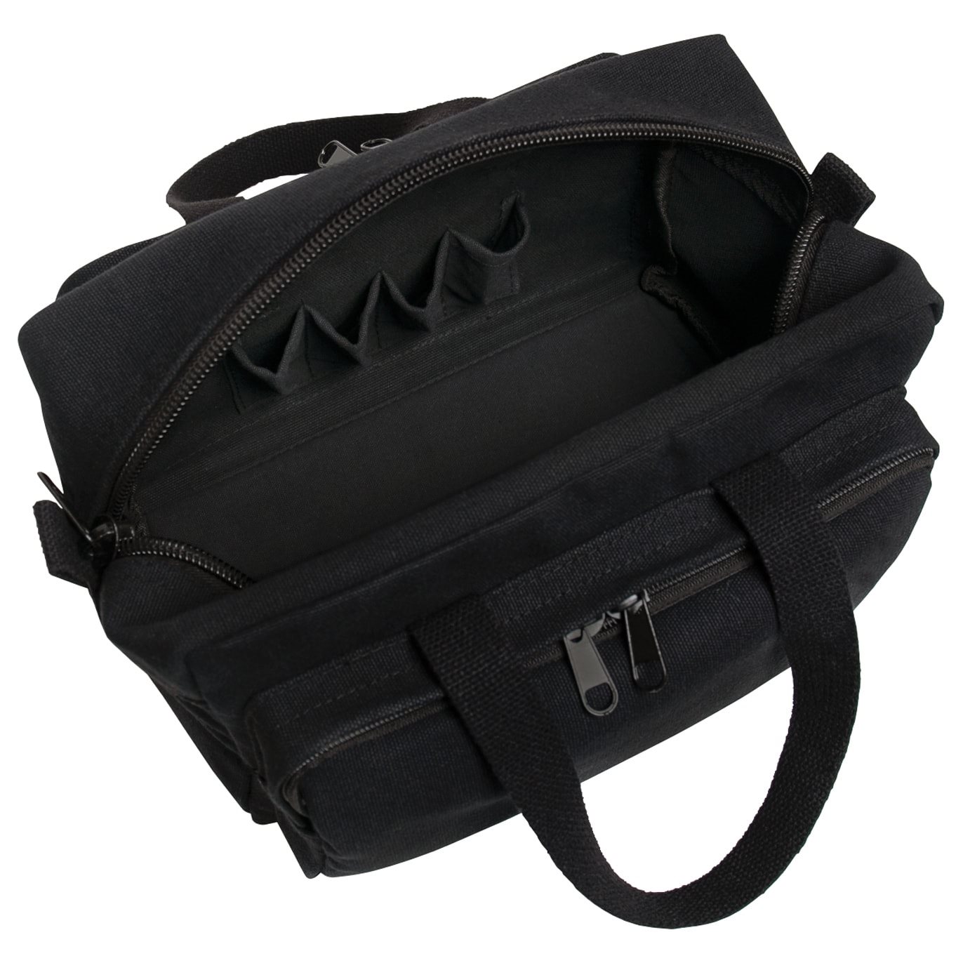 Sia sulla parte anteriore che su quella posteriore della borsa sono presenti tasche relativamente capienti, accessibili tramite cerniere metalliche a doppio cursore. Sono ideali per trasportare gli oggetti che devono essere rapidamente a portata di mano. Lo scomparto principale si apre con una cerniera metallica a senso unico e all'interno sono presenti diverse piccole tasche e scomparti. Questi consentono di organizzare in modo rapido e comodo l'attrezzatura trasportata, a seconda delle esigenze. Il fondo della borsa è liscio. La tasca frontale è decorata con una scritta "militare" ornamentale.