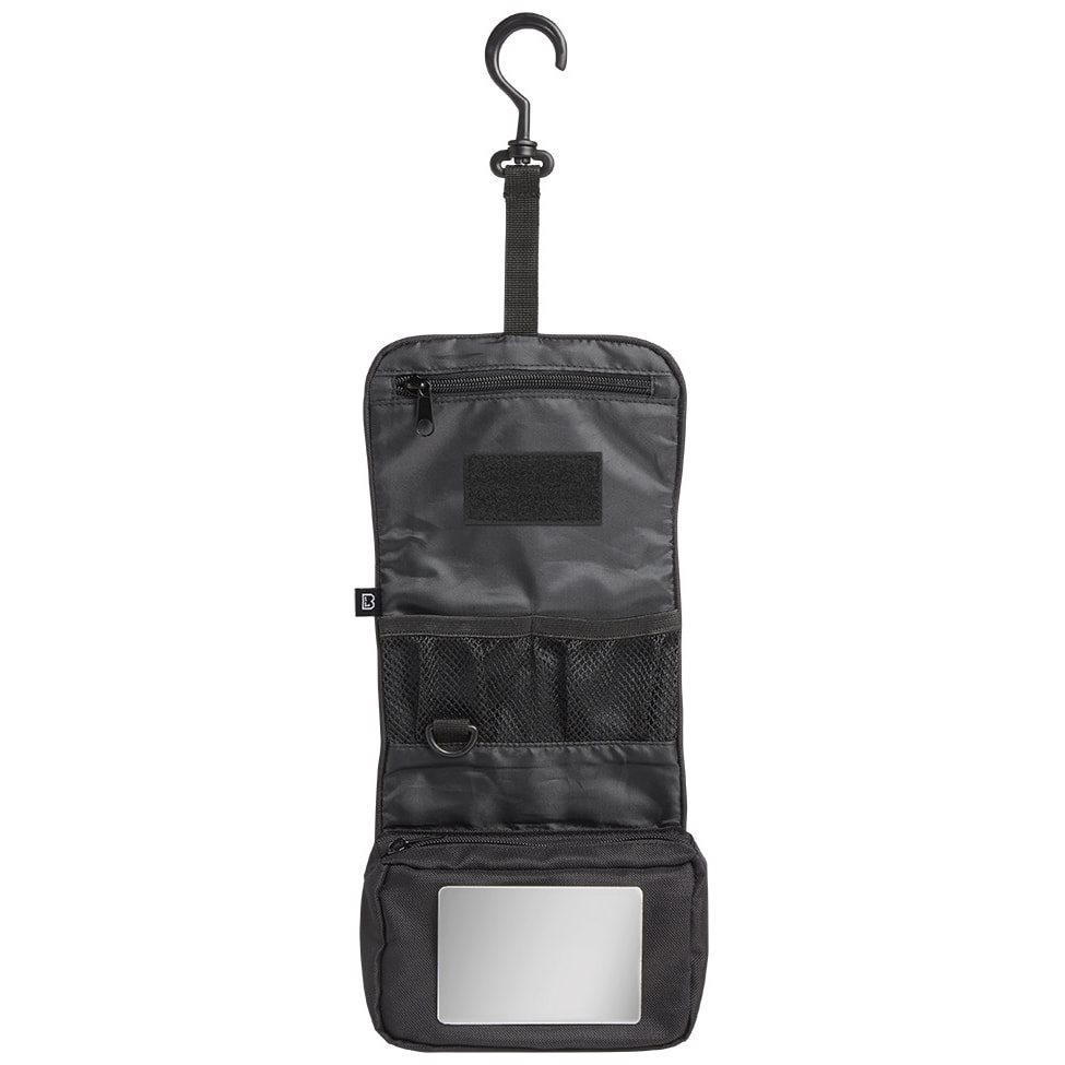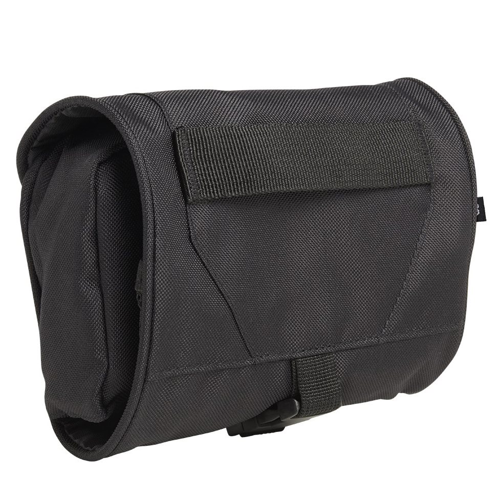 Borsa pratica progettata principalmente per riporre articoli per l'igiene personale. La custodia è arrotolabile e, una volta chiusa, viene fissata con una cinghia regolabile in lunghezza con fibbia in plastica. Una volta aperta, all'interno troverete una tasca piuttosto spaziosa con chiusura a zip, uno specchio infrangibile, un anello a D in plastica, due scomparti aperti in rete, una tasca piatta con zip e un pannello in velcro per fissare ulteriori accessori. L'intera custodia può essere appesa grazie a un gancio in plastica.