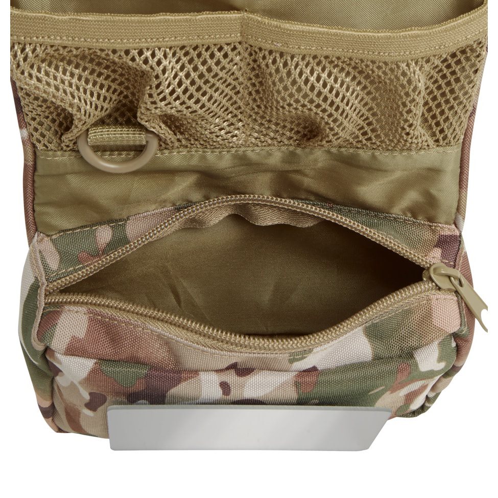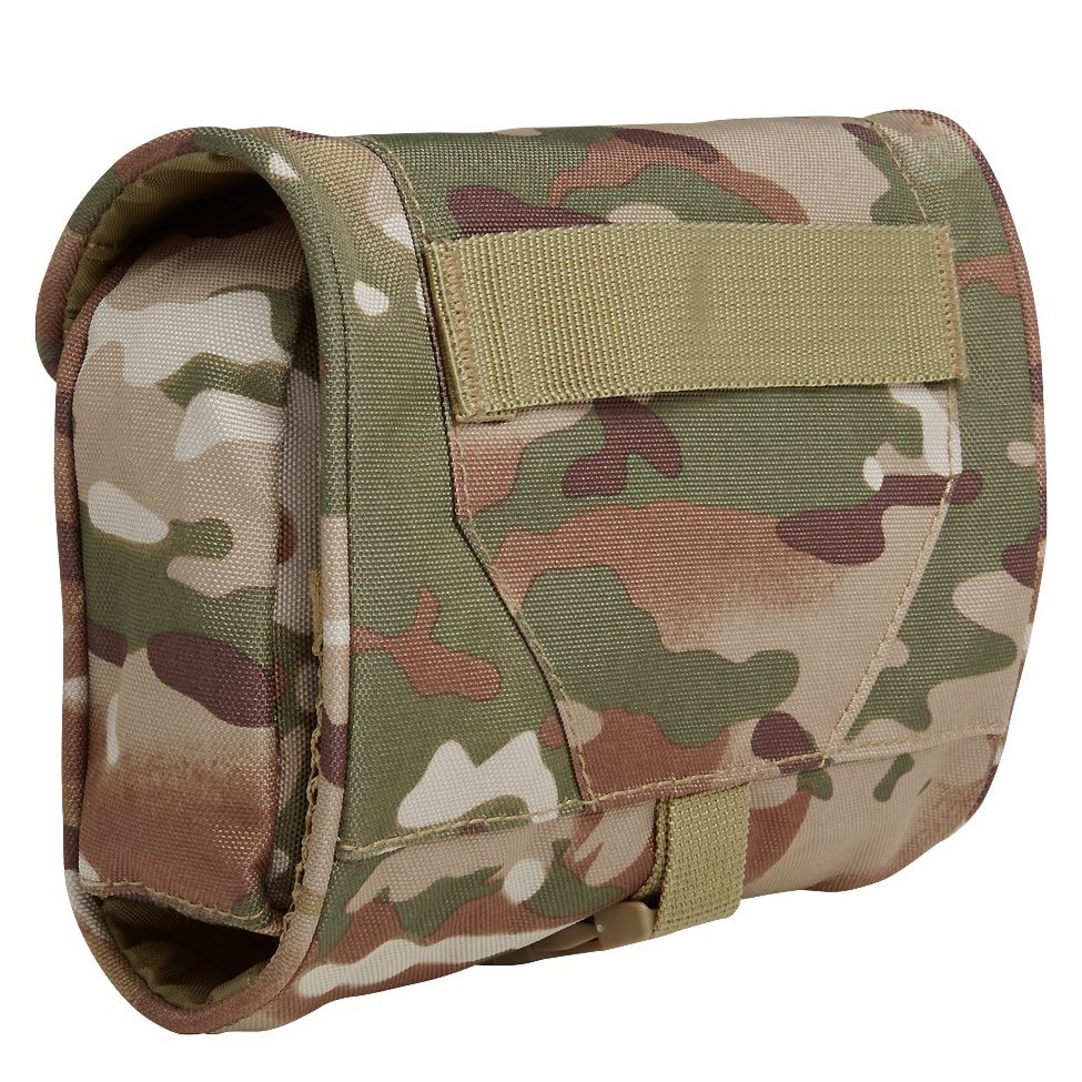 Borsa pratica progettata principalmente per riporre articoli per l'igiene personale. La custodia è arrotolabile e, una volta chiusa, viene fissata tramite una cinghia regolabile in lunghezza con fibbia in plastica. Una volta aperta, all'interno troverete una tasca piuttosto spaziosa con chiusura a zip, uno specchio infrangibile, un anello a D in plastica, due scomparti aperti in rete, una tasca piatta con zip e un pannello in velcro per fissare ulteriori accessori. L'intera custodia può essere appesa grazie a un gancio in plastica.