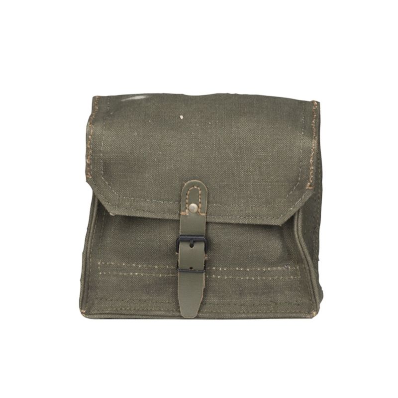 Borsa storica, presumibilmente utilizzata per munizioni. Include una robusta tracolla in pelle. All'interno presenta due scomparti con patta in pelle. Chiusura con fibbia in pelle. Dimensioni: circa 20x16x9 cm.
