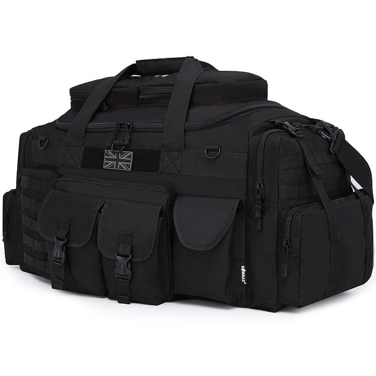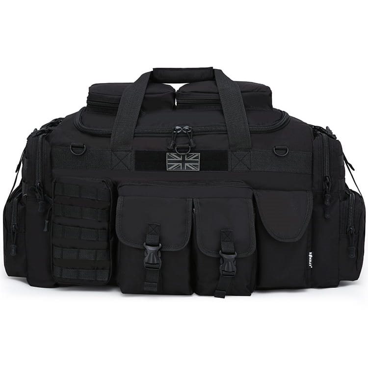 Sul lato anteriore ci sono in totale 5 tasche: una tasca piatta con cerniera, su cui sono posizionate due tasche con patta e fibbia in plastica. Sul lato destro c'è una tasca con chiusura in velcro, mentre sul lato sinistro c'è una tasca con cerniera che ha sul lato esterno cinque cinghie MOLLE. Se necessario, è possibile agganciarvi altre attrezzature più piccole con chiusura MOLLE/PALS. Al centro, sopra la tasca, si trova una tasca con chiusura in velcro. cinque cinghie MOLLE. Se necessario, è possibile agganciarvi ulteriori piccoli accessori con attacco MOLLE/PALS. Al centro, sopra le tasche, è presente una striscia di velcro con una toppa con la bandiera britannica e tre anelli D in plastica. I lati della borsa sono dotati allo stesso modo: su di essi si trova una grande tasca su tutto il perimetro laterale. La tasca si chiude con una cerniera e nella sua parte superiore sono presenti due