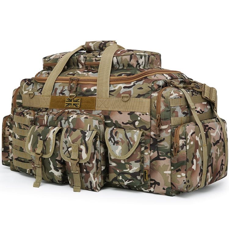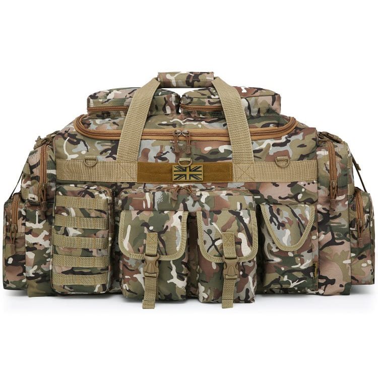 Sul lato anteriore ci sono in totale 5 tasche: una tasca piatta con cerniera, su cui sono posizionate due tasche con patta e fibbia in plastica. Sul lato destro c'è una tasca con chiusura in velcro, mentre sul lato sinistro c'è una tasca con cerniera che ha sul lato esterno cinque cinghie MOLLE. Se necessario, è possibile agganciarvi altre attrezzature più piccole con chiusura MOLLE/PALS. Al centro, sopra la tasca, c'è una tasca con chiusura in velcro. cinque cinghie MOLLE. Se necessario, è possibile agganciarvi ulteriori piccoli accessori con attacco MOLLE/PALS. Al centro, sopra le tasche, è presente una striscia di velcro con una toppa con la bandiera britannica e tre anelli a D in plastica. I lati della borsa sono dotati allo stesso modo: su di essi si trova una grande tasca lungo tutto il perimetro laterale. La tasca si chiude con una cerniera e nella sua parte superiore sono presenti due