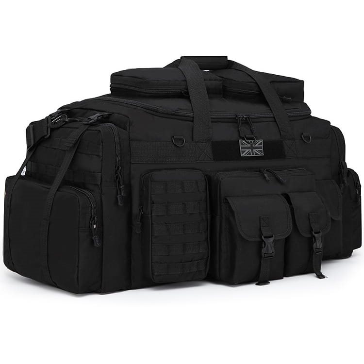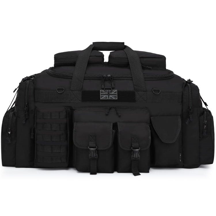 Sul lato anteriore ci sono in totale 5 tasche: una tasca piatta con cerniera, su cui sono posizionate due tasche con patta e fibbia in plastica. Sul lato destro c'è una tasca con chiusura in velcro, mentre sul lato sinistro c'è una tasca con cerniera che ha sul lato esterno cinque cinghie MOLLE. Se necessario, è possibile agganciarvi altre attrezzature più piccole con chiusura MOLLE/PALS. Al centro, sopra la tasca, c'è una tasca con chiusura in velcro. cinque cinghie MOLLE. Se necessario, è possibile agganciarvi ulteriori piccoli accessori con attacco MOLLE/PALS. Al centro, sopra le tasche, è presente una striscia di velcro con una toppa con la bandiera britannica e tre anelli D in plastica. I lati della borsa sono dotati allo stesso modo, con una grande tasca su tutto il perimetro laterale. La tasca si chiude con una cerniera e nella parte superiore sono presenti due