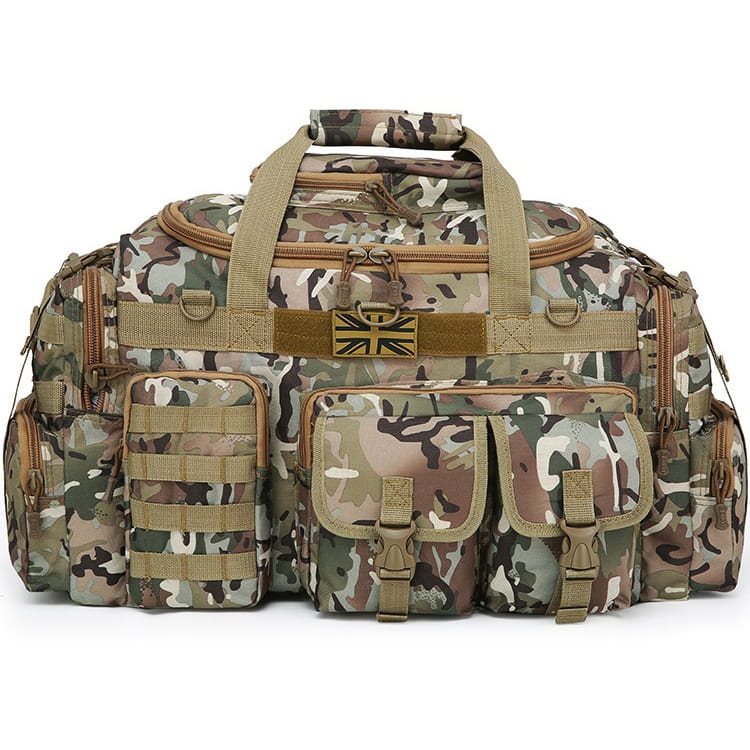 Sulla parte anteriore ci sono in totale 4 tasche: una tasca piatta con cerniera, su cui sono posizionate due tasche con patta e fibbia in plastica. Sul lato sinistro è presente una tasca con cerniera, che ha cinque cinghie MOLLE sul lato esterno. Se necessario, è possibile agganciarvi altri piccoli accessori con attacco MOLLE/PALS. Al centro, sopra le tasche, c'è una striscia di velcro con una toppa con la bandiera britannica e tre anelli a D in plastica.