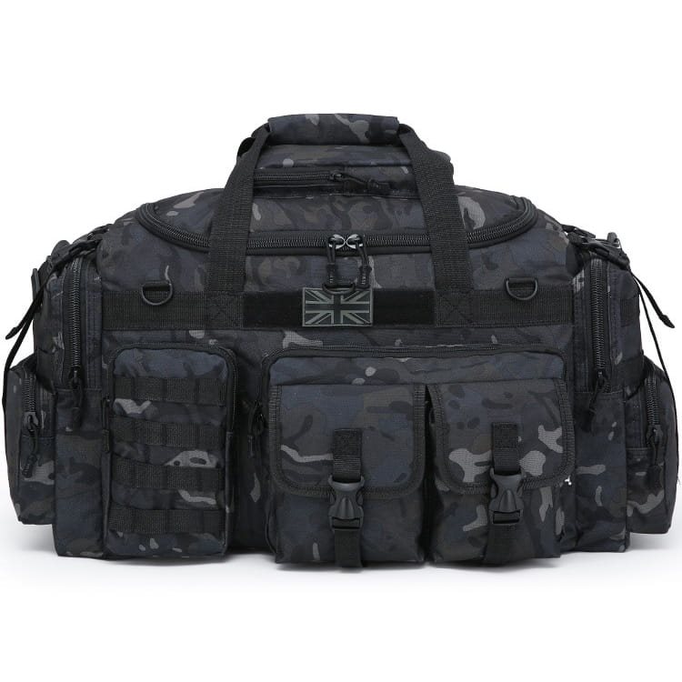 Sulla parte anteriore ci sono in totale 4 tasche: una tasca piatta con cerniera, su cui sono posizionate due tasche con patta e fibbia in plastica. Sul lato sinistro è presente una tasca con cerniera, che ha cinque cinghie MOLLE sul lato esterno. Se necessario, è possibile agganciarvi altri piccoli accessori con attacco MOLLE/PALS. Al centro, sopra le tasche, è presente una striscia di velcro con una toppa con la bandiera britannica e tre anelli a D in plastica.