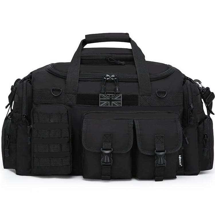 Sulla parte anteriore ci sono in totale 4 tasche: una tasca piatta con cerniera, su cui sono posizionate due tasche con patta e fibbia in plastica. Sul lato sinistro è presente una tasca con cerniera, che ha cinque cinghie MOLLE sul lato esterno. Se necessario, è possibile agganciarvi altri piccoli accessori con attacco MOLLE/PALS. Al centro, sopra le tasche, è presente una striscia di velcro con una toppa con la bandiera britannica e tre anelli a D in plastica.