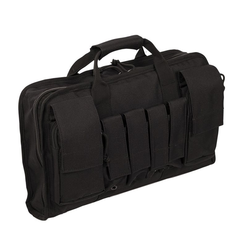 Sulla parte anteriore della borsa sono presenti sei pratici scomparti: due universali accessibili tramite cerniera e quattro scomparti per caricatori di pistola fissati con chiusura in velcro. La parte posteriore è ricoperta da un sistema di aggancio modulare standard MOLLE/PALS, che consente di fissare la borsa ad altre attrezzature tattiche. Lo scomparto principale è accessibile tramite una cerniera a doppio cursore con possibilità di chiusura con lucchetto (lucchetto non incluso). All'interno si trovano due pratiche tasche e diversi elastici per fissare saldamente le pistole.