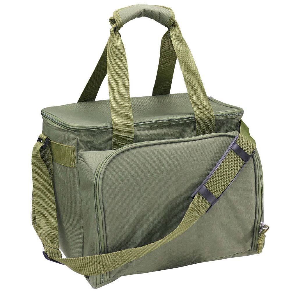 Borsa da picnic verde da esterno a tracolla con set di stoviglie per quattro persone.