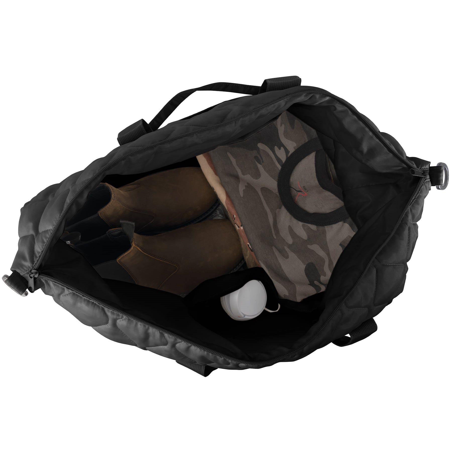 Per trasportare comodamente la borsa è possibile utilizzare la tracolla staccabile e regolabile in lunghezza o le due classiche maniglie non imbottite. All'esterno sono presenti due tasche piatte con chiusura a zip, mentre all'interno dello scomparto principale si trovano quattro tasche organizzative per piccoli oggetti. Lo scomparto principale è chiuso da una cerniera a doppio cursore.
