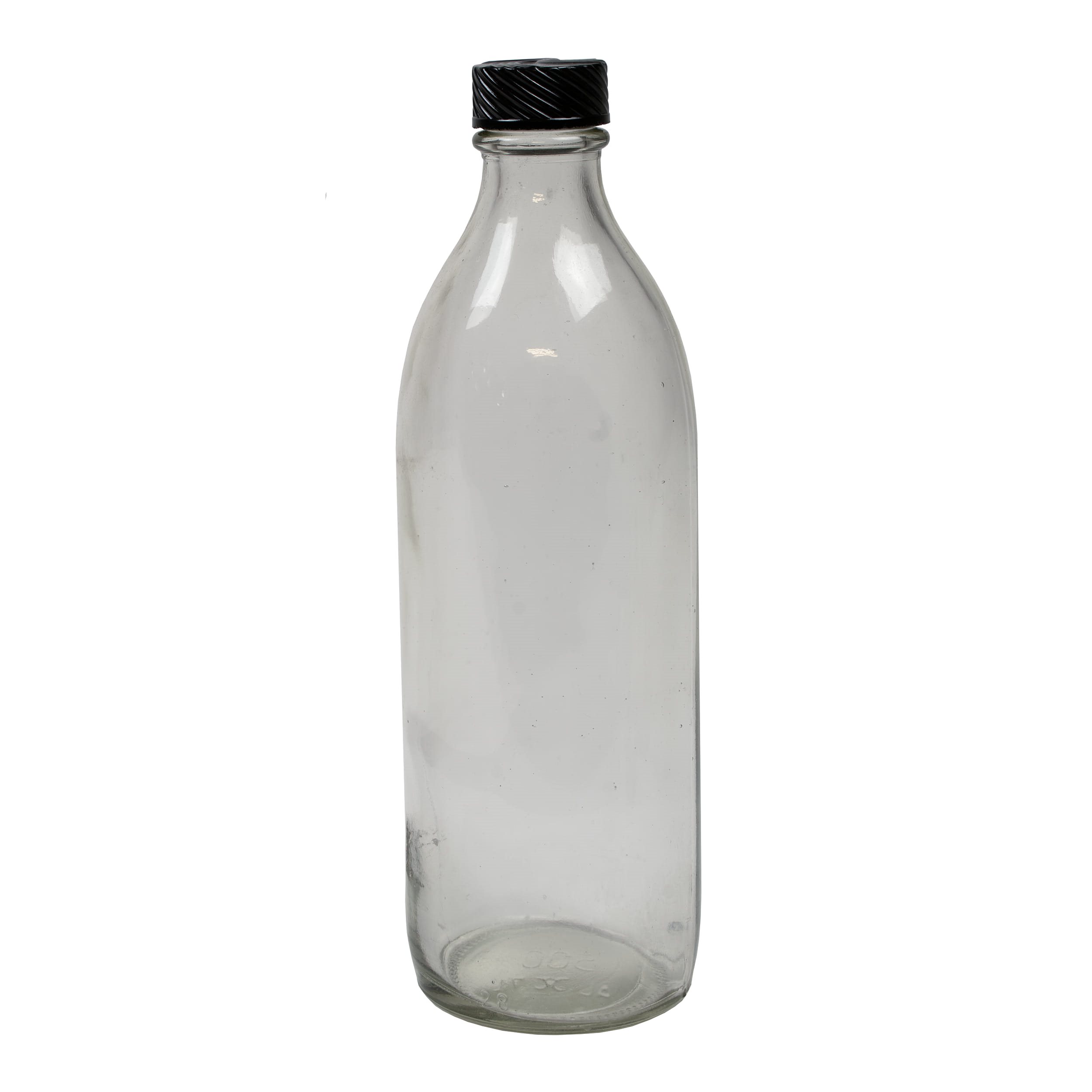 Bottiglia di vetro trasparente con collo stretto e tappo in plastica con guarnizione. Conosciuta anche come flacone per medicinali. Ulteriori informazioni