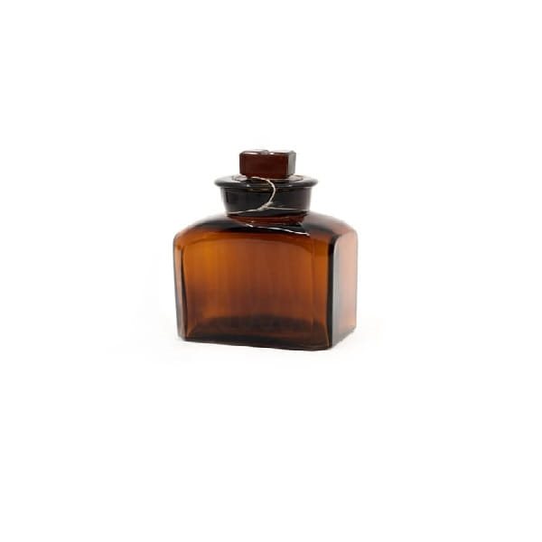 Bottiglia di vetro marrone scuro con forma squadrata.